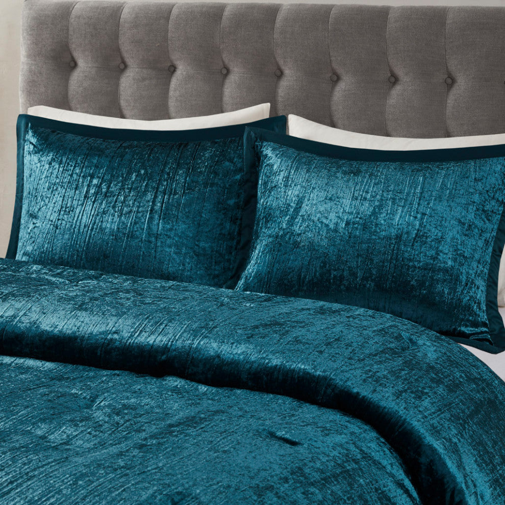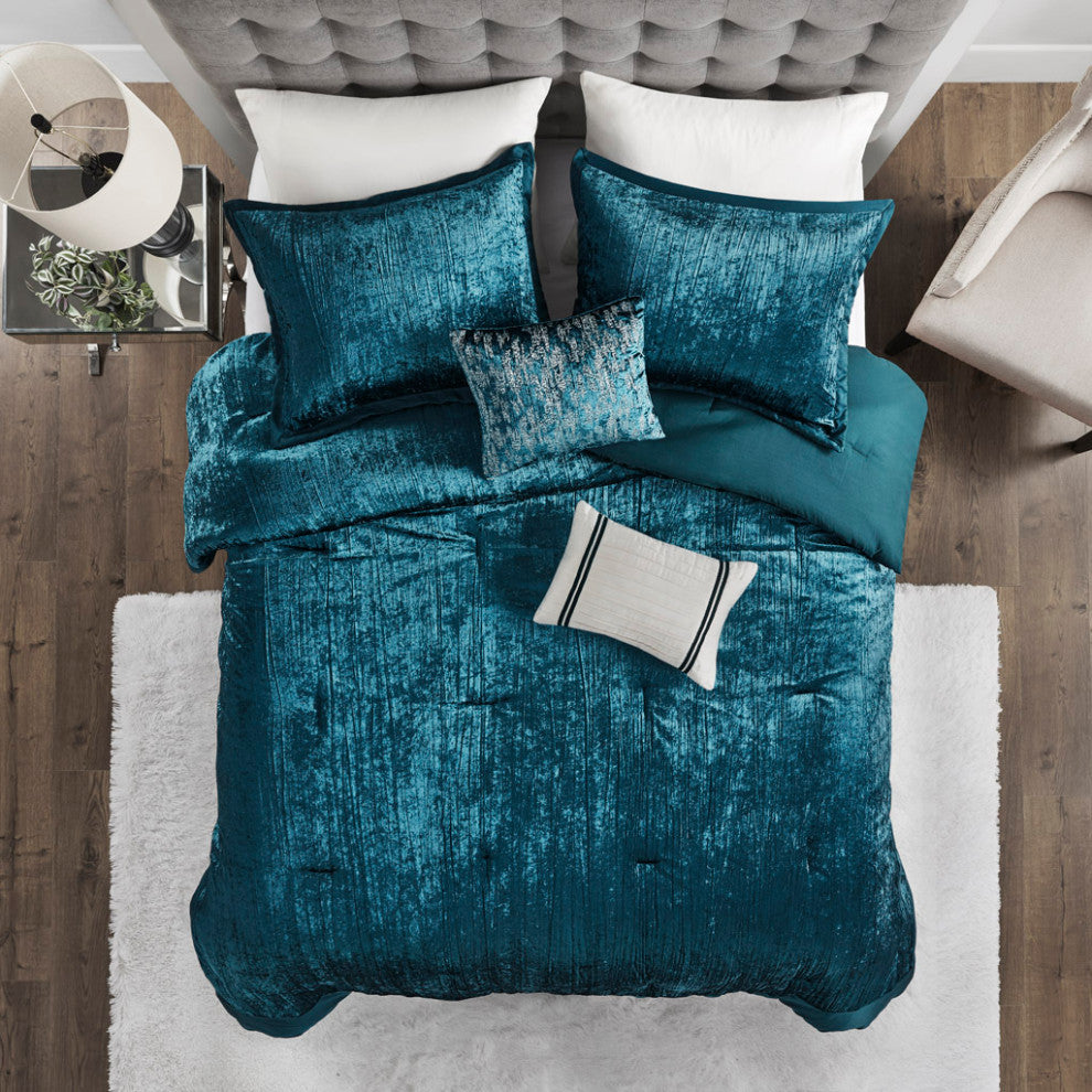 Give your bedroom a glamorous update with this luxurious crinkle velvet comforter set that exudes style and comfort. Crafted with a velvet face and microfiber back, this set also includes two coordinating decorative pillows featuring pleated and embroidery details. Available in multiple color options: regal teal, opulent blush, and prestigious silver. Made with 100% hypoallergenic polyester filling, this bedding set is not only stylish but also practical.FEATURESSet includes comforter, 2 matching shams, and 2 throw pillowsCrinkle Velvet; Microfiber reverse; 100% polyester fillingLuxe/Glam style featuring crushed heat pleated velvet look with charmeuse borderCoordinating pleat and embroidery details on throw pillowsMachine washable and spot clean fabric (See care label)Throw pillow(s) may come in compressed packagingThrow pillow(s) will need to be fluffed up if compressedHypoallergenic polyester filling in the comforter and pillow (filling contains no allergens and is treated to be dustproof)MATERIALSComforter/Sham: 100% polyester crinkled velvet face, microfiber solid reverseFill: 100% polyesterPillows: 100% polyesterSIZE 1 Comforter:104"W x 92"L2 King Shams:20"W x 36"L (2)1 Oblong Throw Pillow:12"W x 18"L1 Square Throw Pillow:16"W x 16"L