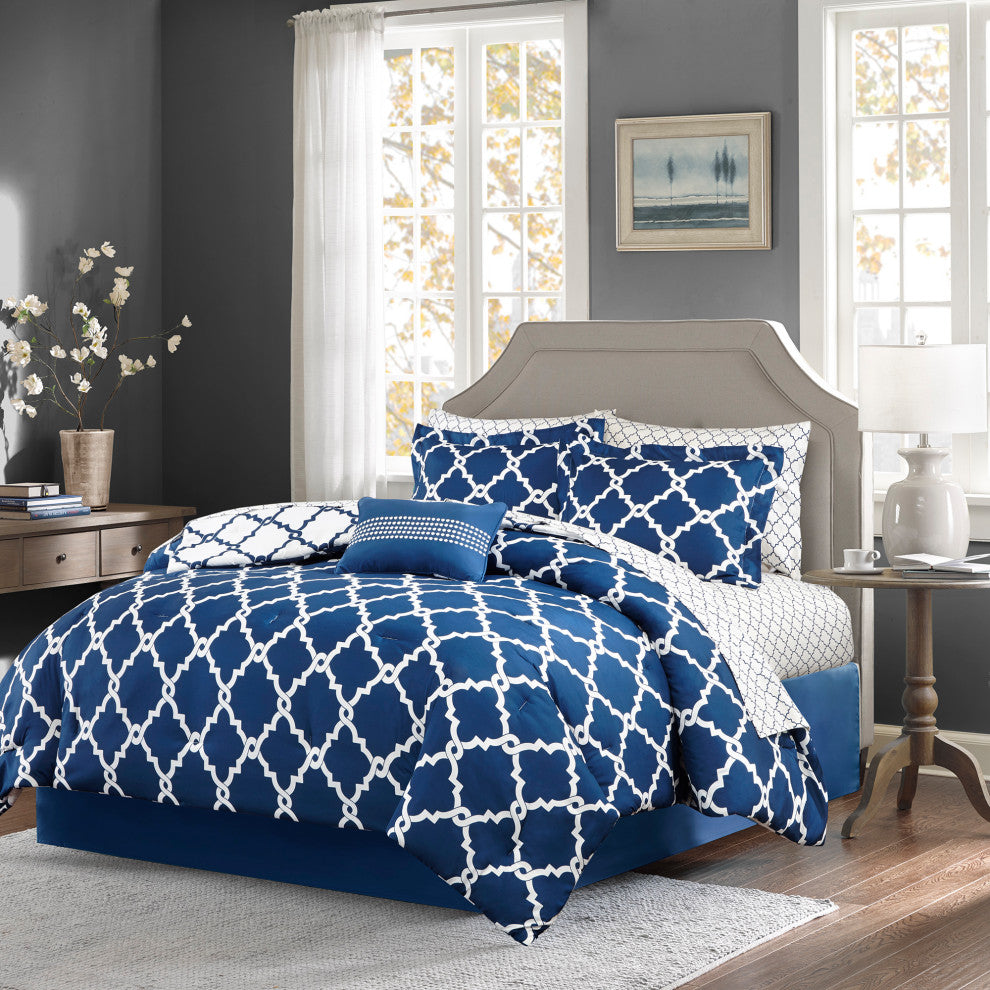 The Madison Park Essentials Merritt Reversible Complete Comforter and Cotton Sheet Set adds a simple yet chic look to your space. The comforter features a fretwork design against a vivid base that flips the color scheme on the reverse, for two distinct modern looks. Matching shams (1 in Twin Sizes) mirror the design on the face of the comforter, while an embroidered decorative pillow and solid bedskirt complete the bedding set. The included 100% cotton printed sheet set features a smaller scale fretwork pattern that complements the comforter. Bringing the best in health and wellness, this bedding set also features an anti-microbial treatment that provides built-in freshness protection, reducing the growth of odor causing bacteria and keeps fabric lasting longer. This bedding set is also OEKO-TEX certified, meaning it does not contain any harmful substances or chemicals, ensuring quality comfort and wellness. This bedding set may come in rolled or compressed packing and will need to be fluffed up. Use a steam iron to help remove wrinkles easier.Size :2 King Shams:20x36"(2)1 Fitted Sheet:78x80+14"1 Bed Skirt:78x80+15"2 Pillowcases:20x40"(2)1 Comforter:104x92"1 Flat Sheet:108x102"1 Decorative Pillow:12x18"Material:Microfiber, printed, comforter and shams, 7.3oz/sq yard polyester fill, microfiber bedskirt and pillow, cotton printed sheet setFeatures:Reversible contemporary all over fretwork design printed comforter set and cotton sheet setFeatures an anti-microbial treatment for odor and bacteria control, which enhances hygiene and keeps the fabric fresher, longerSet includes comforter, bedskirt (15" drop), 2 shams (1 in Twin), 1 oblong pillow, fitted and flat sheet and 2 pillowcases (1 in Twin)Embroidered decorative pillow detailingHypoallergenic polyester filling in the comforter and pillows (filling contains no allergens and is treated to be dustproof)Fitted sheet fits up to a 14-inch (12-inch in Twin size) mattress OEKO-TEX certified, meaning it has no harmful substances or chemicals for quality comfort and wellnessItems in this set may come in rolled or compressed packaging and will need to be fluffed upMachine Washable and steam iron for wrinkle removal