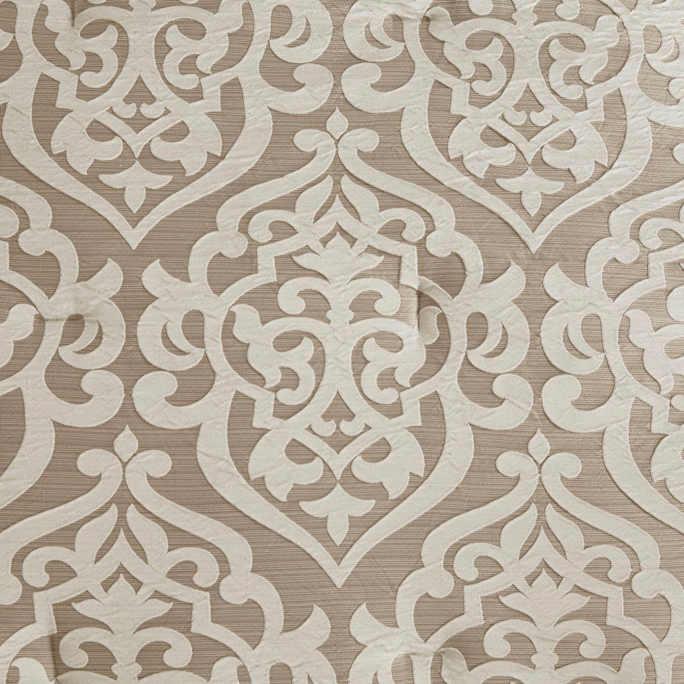 Add a touch of class to your bedroom with the Madison Park Odette 8 Piece Jacquard Comforter Set. The luxurious textured jacquard comforter and shams flaunt a gorgeous damask medallion design with ivory striations on the satin ground that add dimension to the lavish look. A solid neutral reverse and stunning Euro shams complement the top of the bed to complete the ensemble. Also included are two decorative pillows that feature embroidery and cording details, while a solid neutral bed skirt provides a clean and elegant finish. Machine washable for easy care, This jacquard comforter set offers a strikingly luxurious update to your decor. Items in the set may come in a rolled or compressed packaging, which will need to be fluffed up or steam ironed before use to remove wrinkles.FEATURESTextured jacquard 8 piece comforter setClassic and elegant damask medallion jacquard weave in soft colors with solid on the reverse sideBeautiful embroidered pillow with decorative cording detailsMedium weight intended for year round useSet includes 1 comforter, 2 euro shams, 2 shams, 2 decorative pillows and 1 bed skirtHypoallergenic polyester filling in the comforter and pillow (filling contains no allergens and is treated to be dustproof)Machine washable for easy care; Steam iron for wrinkle removalItems in this set may come in rolled or compressed packaging and will need to be fluffed upMATERIALSComforter/Sham: 100% polyester jacquard with damask stria texture face, 100% polyester microfiber reverseFilling: 100% polyester, 8 OSYEuro Sham: 100% polyester charmeuseBed Skirt: 100% polyester charmeuse, 100% polyester platformDec Pillows: 100% polyester charmeuse, embroidered with decorative cording, 100% polyesting fillingSIZE 1 Comforter:104"W x 92"L2 King Shams:20"W x 36"L + 2"D (2)1 Bedskirt:78"W x 80"L + 15"D2 Euro Shams:26"W x 26"L + 2"D (2)1 Decorative Pillow:18"W x 18"L1 Decorative Pillow:12"W x 18"L