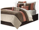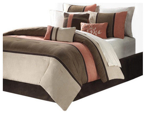 The Madison Park 7 Piece Palisades Comforter Set offers you a casual alternative in fashion bedding. The reverse of the comforter is solid coral. The soft microsuede in ivory, coral and brown is pieced together to create this beautiful bed. The decorative pillows are embroidered and pieced to add a decorative element to this simple, yet beautiful bedding collection. With hypoallergenic filling in the comforter and pillows, this stylish comforter set easily refreshes your bedroom decor and is machine washable for easy care. Items in the set may come in a rolled or compressed packaging, which will need to be fluffed up or steam ironed before use to remove wrinkles.Size :1 Comforter:104"W x 92"L2 King Shams:20"W x 36"L (2)1 Bedskirt:72"W x 84"L + 15"D1 Decorative Pillow:18"W x 18"L1 Decorative Pillow:12"W x 18"L1 Decorative Pillow:10"W x 18"LMaterial:Comforter/Sham: 100% polyester faux suede, pieced, 100% polyester reverse, 6oz/yd2 polyester fillingBedskirt: 100% polyester faux suede, polyester platformPillow: microsuede, polyester fillingFeatures:Faux suede 7 piece comforter set in balanced and pieced coordinated colorsColorblock comforter set in top stitching details on the comforterIdeal for cabin bedding or lodge bedding home decorSet includes 1 comforter, 2 matching shams, 2 square and 1 oblong decorative pillows and 1 bed skirtHypoallergenic polyester filling in the comforter and decorative pillowsMachine washable and steam iron for wrinkle removalItems in this set may come in rolled or compressed packaging and will need to be fluffed up