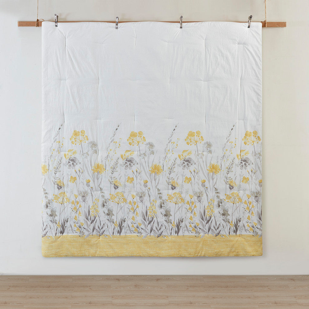 Featuring a floral print on a white ground and a yellow border at the foot, this seersucker microfiber comforter set exudes a cottage farmhouse style that adds a touch of modern to any bedroom. The two decorative pillows feature gorgeous embroidery and ruching that complements the bedding print, adding to the overall charm of the set. Colors featured in this set include shades of grey, taupe, and yellow. The comforter and pillows are filled with hypoallergenic polyester filling that is treated to be dustproof, ensuring a restful and comfortable sleeping experience.FEATURESSet includes comforter, 2 matching shams and 2 throw pillowsPrinted seersucker microfiber polyester; 100% polyester comforter and pillow fillingModern Cottage Farmhouse style featuring a floral print in grey and yellow hues on white backdropThrow pillows featuring embroidery and ruching detailsMachine washable and spot clean pillowThrow pillow(s) may come in compressed packagingThrow pillow(s) will need to be fluffed up if compressedHypoallergenic polyester filling in the comforter and pillow (filling contains no allergens and is treated to be dustproof)MATERIALSComforter/Sham: Printed soft microfiber seersucker face, solid microfiber reverseFill: 100% polyesterPillow: Microfiber cover with polyester fillSIZE 1 Comforter:104"W x 92"L2 King Shams:20"W x 36"L (2)1 Oblong Throw Pillow:12"W x 18"L1 Square Throw Pillow:18"W x 18"L