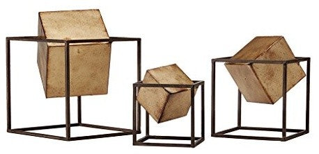 The Madison Park Quad Gold Cubes 3-piece Tabletop Decor Set shapes up your space with its geometric and modern style. These home decor accents feature black metal frame bases with distressed painted gold cubes on the inside, for a unique and eye-catching look. Comes as a 3 piece set in varying sizes, these metal decorative objects are great for displaying together on table tops and shelves, or separately around your home to add a contemporary touch to any space. Handle with care; wipe gently clean with a damp cloth as needed.Size :Large:8.6"W x 10"H x 8.3"DMedium:6.7"W x 8.1"H x 6.5"DSmall:5.1"W x 5.9"H x 4.9"DMaterial:Metal: 100%Features:Set of 3, measuring 8.6"W x 10"H x 8.3"D, 6.7"W x 8.1"H x 6.5"D, and 5.1"W x 5.9"H x 4.9"DTabletop accessory set features decorative aged gold metal cubesBlack cube baseIndoor use only. Spot clean only