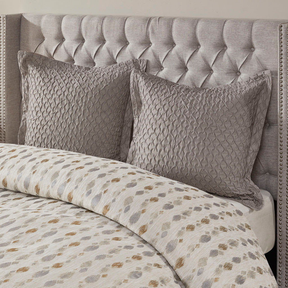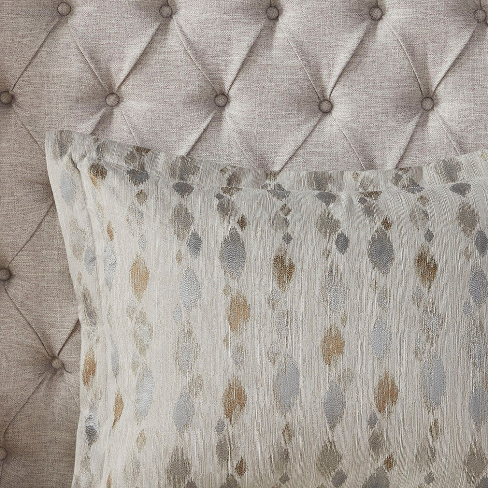 The Madison Park Signature Sanctuary Queen 8 Piece Comforter set offers a luxurious update to your bedroom decor. The oversized and overfilled jacquard comforter features all-over symmetric diamond shapes, in ivory, taupe, gold and silver, with slubbed yarns that create a rich texture and modern look. A heavyweight comforter insert is secured inside the comforter with 4 inner ties and a button closure and is removable for easy care. Two matching shams pair beautifully with the comforter, while coordinating euro shams complete the top of the bed. Also included are 2 square decorative pillows and 1 oblong decorative pillow with embroidered details that provide the finishing touches to this jacquard comforter set. Hypoallergenic polyester filling in the comforter insert and the decorative pillows offers exceptional warmth and comfort. Add beauty and grace to your bedroom by incorporating this jacquard comforter set into your decor. Dry clean comforter cover only and machine wash comforter filler.FEATURESLuxurious, glam lifestyle chenille jacquard comforter setFeatures all-over symmetric diamond shapes, in ivory, taupe, gold and silver, with slubbed yarns that create a rich texture and modern lookOversized and overfilled comforter with removable insert (included), inner ties, and hidden button closureDuvet style comforter insert, so no visible bartacking lines seen on top of the bedSet includes comforter, 2 shams, 2 euro shams (3 in King size), 2 square and 1 oblong decorative pillowsFabric manipulation and embroidered decorative pillows have removable cover with hidden zipperHypoallergenic polyester filling in the comforter and pillow (filling contains no allergens and is treated to be dustproof)Dry clean comforter cover and machine washable comforter fillerMATERIALSComforter face: 100% polyester jacquard; Back: 100% polyester micro fiber 95gsm, removable seperate polyester filler inserts ( 300g/sqm )Euro sham: 100% cotton faux linen elastic embroidery on face20x20" square cover: 100% cotton faux linen with embroidery on face20" square" 100% cotton faux line with elastic embroidery on face14x20" oblong pillow: 100% cotton faux liene with embroidery on faceAll pillows polyester fill with hidden zipperSIZE 1 Comforter:92"W x 96"L2 Standard Shams:20"W x 26"L + 2"D (2)2 Euro Shams:26"W x 26"L + 2"D (2)2 Decorative Pillows:20"W x 20"L (2)1 Decorative Pillow:14"W x 20"L