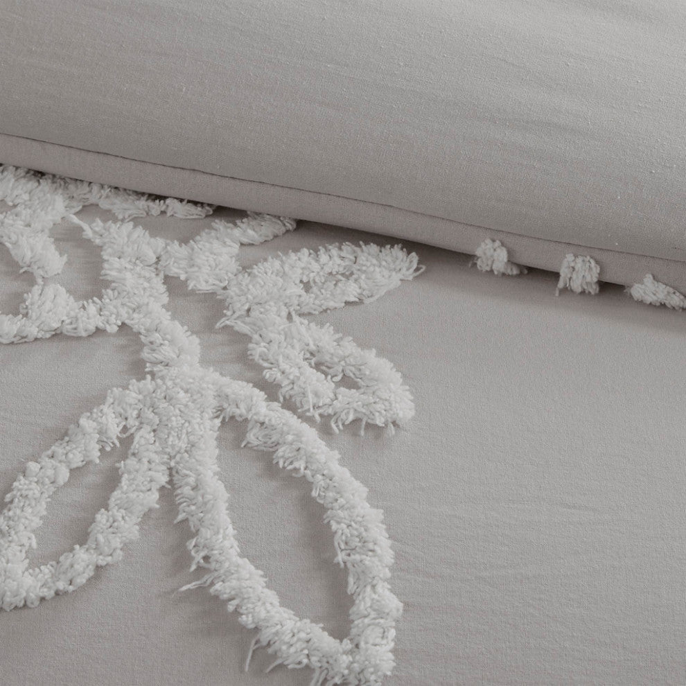 Complete your bedroom decor with the Madison Park Veronica 3 Piece Tufted Chenille Floral Comforter Set. The shabby chic comforter features white cotton tufted chenille floral pattern on a warm grey background that creates a lovely contrast. The 2 matching shams mirror the design of the comforter to complete the farmhouse aesthetic, while hypoallergenic filling in the comforter provides exceptional warmth and comfort. Machine washable for easy care, this tufted chenille comforter set offers a soft shabby chic look to elevate your bedroom decor. Due to the nature of the chenille fabric, some shedding will occur naturally in the first 3-4 washes. Items in the set may come in a rolled or compressed packaging, which will need to be fluffed up or steam ironed before use to remove wrinkles.FEATURESSet includes 1 comforter and 2 matching shamsShabby chic comforter set in cotton tufted chenille floral detailsPerfect for farmhouse bedroom d cor tooWhite chenille floral pattern on Warm Grey backgroundHypoallergenic polyester filling in the comforterDue to the nature of the chenille fabric, some shedding will occur naturally in the first 3-4 washesMachine washable and steam iron for wrinkle removalItems in this set may come in rolled or compressed packaging and will need to be fluffed upMATERIALS100% cotton chenille with tufted technique comforter and shams, 100% polyester fillingSIZE 1 Comforter:104"W x 92"L2 King Shams:20"W x 36 "L(2)