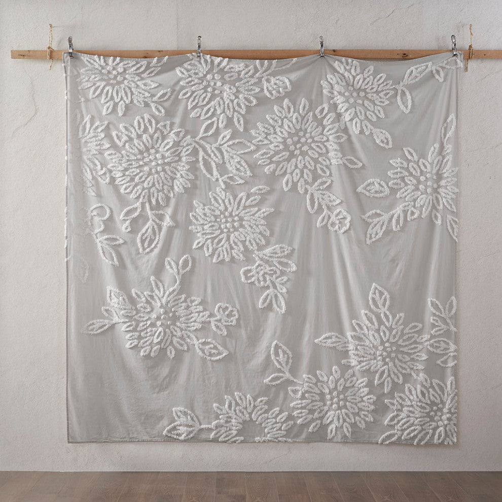 Complete your bedroom decor with the Madison Park Veronica 3 Piece Tufted Chenille Floral Duvet Cover Set. The shabby chic duvet cover features white cotton tufted chenille floral pattern on a warm grey background that creates a lovely contrast. The 2 matching shams mirror the design of the duvet cover to complete the farmhouse aesthetic. Machine washable for easy care, this tufted chenille duvet cover set offers a soft shabby chic look to elevate your bedroom decor. Button closures help secure a comforter insert within the duvet cover and inside ties in the corners help prevent it from shifting (insert is NOT included). Due to the nature of the chenille fabric, some shedding will occur naturally in the first 3-4 washes. Items in the set may come in a rolled or compressed packaging, which will need to be fluffed up or steam ironed before use to remove wrinkles.FEATURESSet includes 1 duvet cover (insert not included) and 2 matching shamsShabby chic duvet set in cotton tufted chenille floral detailsPerfect for farmhouse bedroom d cor tooWhite chenille floral pattern on Warm Grey backgroundInside corner ties to secure the insert, button closureDue to the nature of the chenille fabric, some shedding will occur naturally in the first 3-4 washesMachine washable and steam iron for wrinkle removalItems in this set may come in rolled or compressed packaging and will need to be fluffed upMATERIALS100% cotton chenille with tufted technique duvet and shamsSIZE 1 Duvet Cover:90"W x 90"L2 Standard Shams:20"W x 26 "L (2)