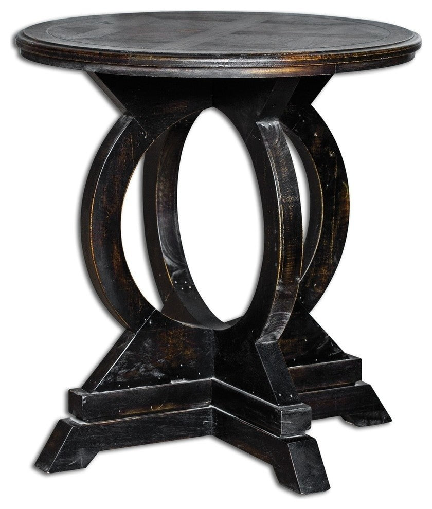 Soft, weathered black finish on solid mango wood circle motif base, with rub- through distressing on the mindi veneer inlay top. 24'''' x 27'''' x 24'''' Mango Wood With P B Heirloom Quality - Expertly hand crafted and hand finished Due to the hand crafted nature of this piece, each piece may have subtle differences.