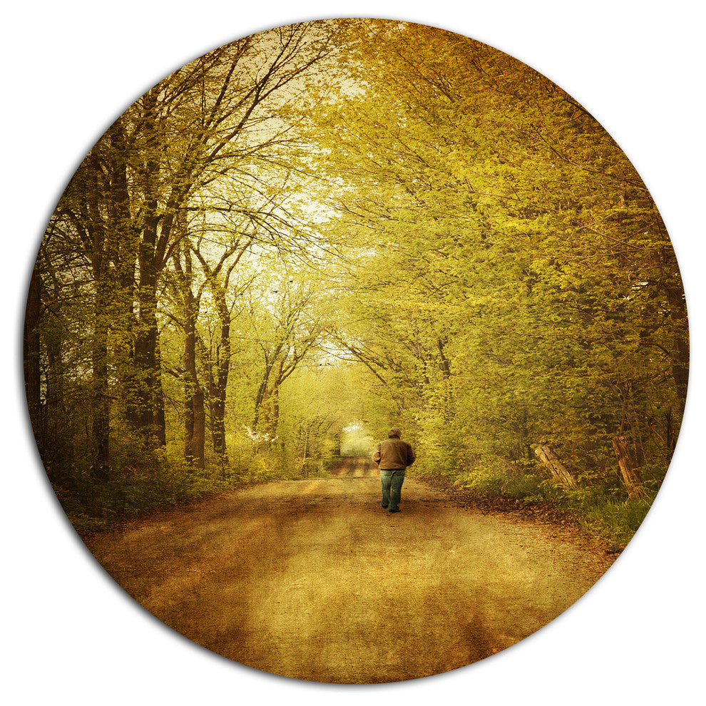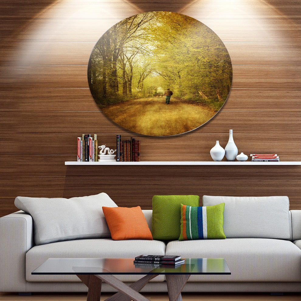 Bring Contemporary Abstraction to your home with this large Circle Metal wall art. This Man Walking Lonely on Rural Road Metal Artwork makes it the focal point of any room or office.