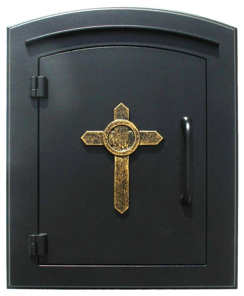 Manchester NON-LOCKING Column Mount Mailbox with "Decorative Cross Logo" in BlackThis decorative cast aluminum mailbox insert can be matched with an optional newspaper holder or add item #man-lckit to convert this to a locking mailbox.The doors have a tough black powder coat finish, are sealed against the weather and it features a tough composite masonry box built to lastOversized masonry box will hold up to seven days of mailMailbox can be easily inset into a column, pilaster or wallFaceplate dimensions: 11"x14.5"Weighs: 10 lbsProduct Dimension(WxDxH): 8.5"x16"x12"Color: Black