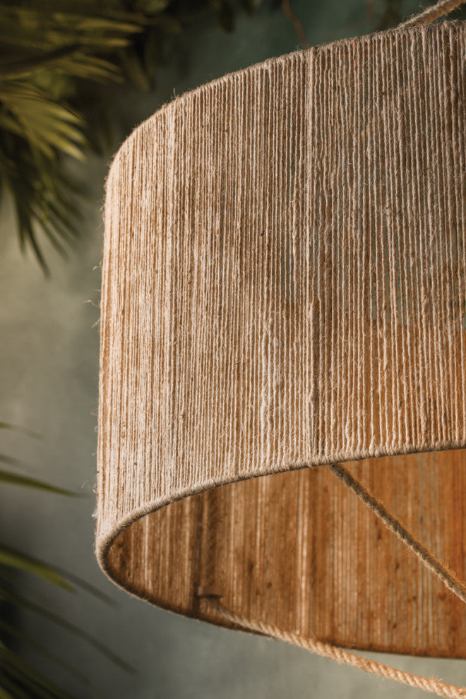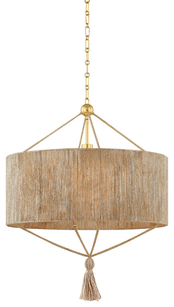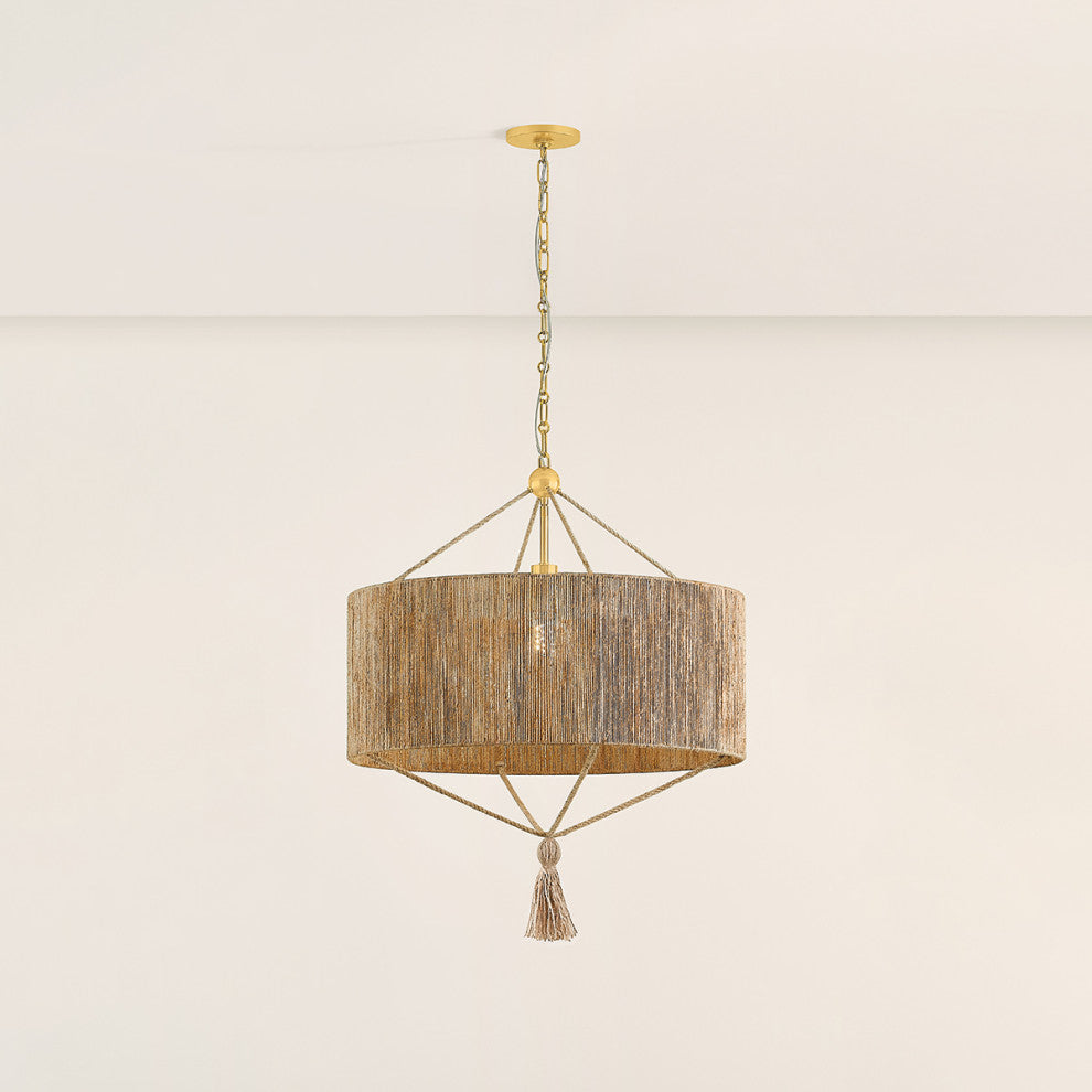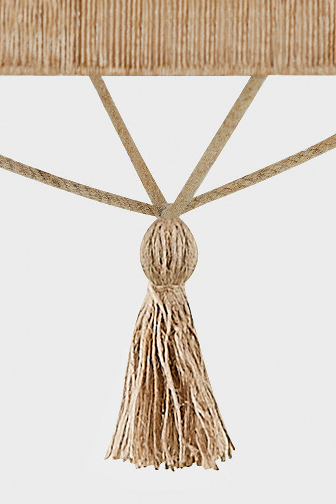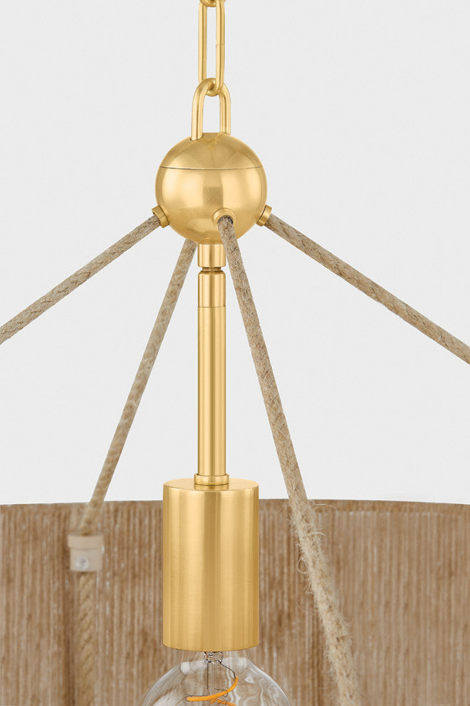 Referencing the construction of traditional Chinese lanterns, the Reyn family elevates drum silhouettes with jewelry-like embellishments. The pendants feature natural woven string in the shades and tassels, while the sconces are accented by wooden spheres. To balance the highly textural nature of the materials, the metalwork is kept clean and minimal with an Aged Brass finish. Part of our Mandy Cheng collection.