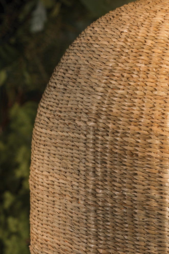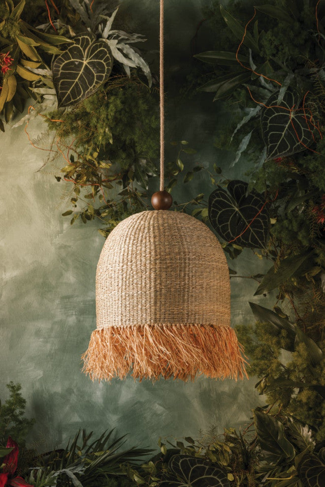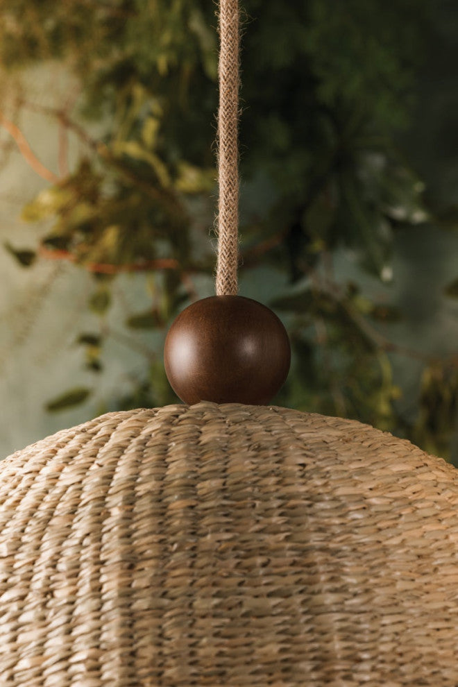 Defined by high-textured materiality, the Sheri family features a natural woven shade with a raffia fringe on the bottom edge. The simple, yet fashionable silhouette is accented by a large Aged Brass sphere detail, adding a contrasting note of metal luster against the organic materials. Available as a pendant, flush mount, table lamp, and sconce, Sheri has versatile applications for modern homes. Part of our Mandy Cheng collection.