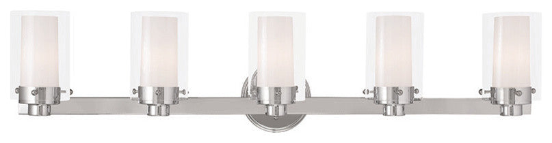 This transitional five light bathroom fixture will bring posh sophistication to your decor. The backplate and simple metal arms give this polished chrome finish a sleek, contemporary look. Opal etched glass surrounds each light, encased in clear glass cylinders for a stunning double-glass effect.Glass Type/Shade Type: Hand Blown Clear Outside Glass and Opal Inside GlassFinish: Polished ChromeMaterial: SteelNumber of Bulbs: 5Bulb Base Type: Candelabra BaseMax Wattage: 60Backplate Size: 5" DiaExtension: 6"Suitable for Dry Locations? YesSuitable for Damp Locations? YesSuitable for Wet Locations? NoADA Compliant? No