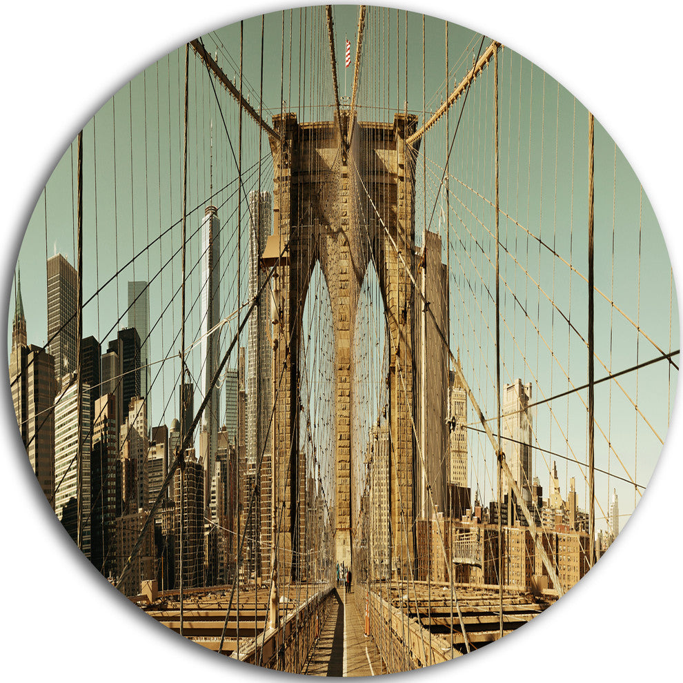 Manhattan Bridge In New York Brown, Cityscape Round Metal Wall Art, 11"