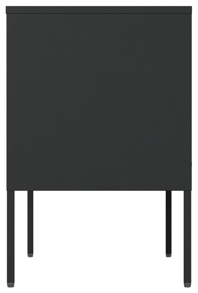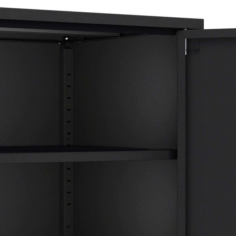 - Features 2 Standard Metal Doors with Vertical Metal Handles.