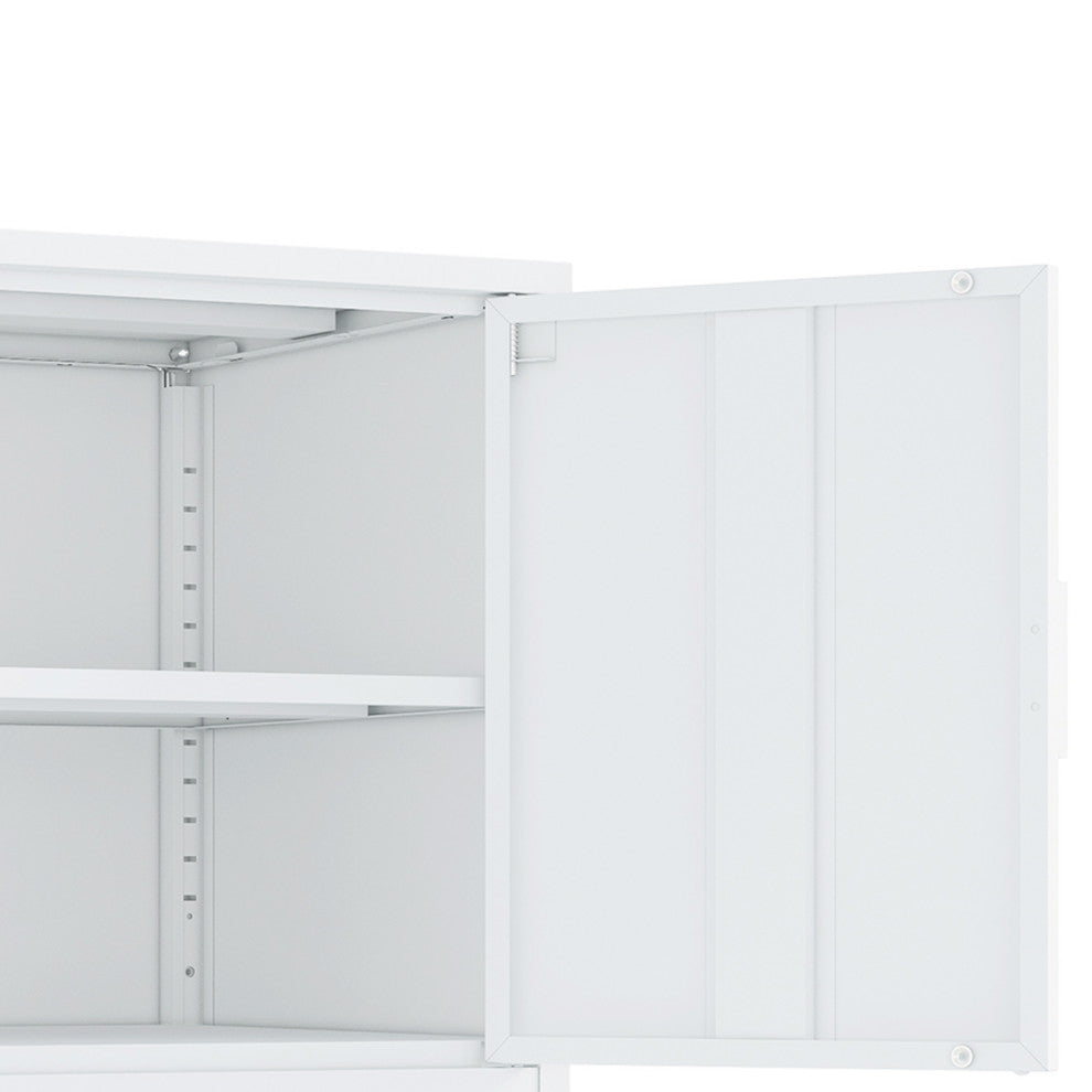 - Features 2 Standard Metal Doors with Vertical Metal Handles.