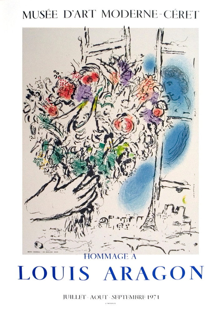 "Floral Offering" by Marc Chagall, 1971 Unsigned Lithograph. Paper size is 26.5 x 19.5 inches, with an image size of 19.25 x 15 inches. The Lithograph is from an edition size of 1500 and is not framed. The condition was rated B: Very Good Condition, with signs of handling or age. Additional details: Poster printed on the occasion of a tribute to Luis Aragon, for an exhibition at the Museum of modern Art of Ceret. Published by the Museum of Ceret. Number 130 in '' Chagall''s Posters - A Cataloque Raisonne'', Sorlier, 1975.