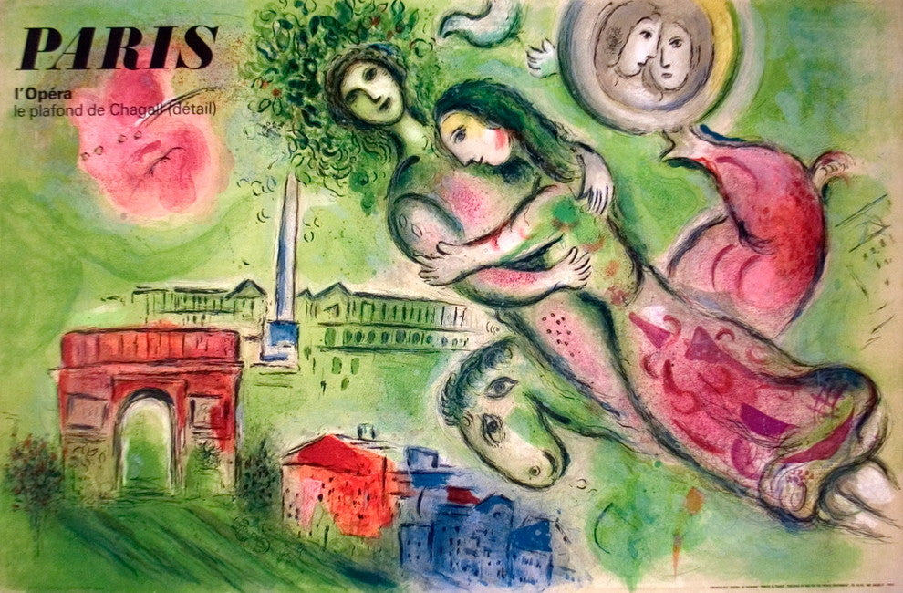 "Romeo and Juliette" by Marc Chagall, 1964 Unsigned Lithograph. Paper size is 25 x 38.5 inches, with an image size of 25 x 38.5 inches. The Lithograph is from an edition size of 5000 and is not framed. The condition was rated A-: Near Mint, very light signs of handling. Additional details: Advertising poster printed for the Office of French Tourism. Taken from a detail of the Ceiling of the Opera. This fragment is a tribute to Berlioz for Romeo and Juliette. It also includes pictures of the Place de la Concorde and the Arc de Triomphe. Published by the French Tourism Bureau, reference page #96 in ''Chagall''s Posters - A Cataloque Raisonne'', Sorlier, 1975 and printed by Mourlot.