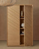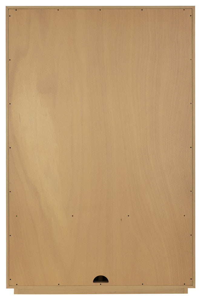 Made of white-oak solids and veneers in a light oak finish, the Margot Natural Oak Storage Chest was inspired by the casual style of California"™s coastal communities. A number of outstanding features include a full chamfered profile edge on the face frame, and a multi-dimensional angled pattern on the doors created with white oak crown veneers. There are generous-sized drawers with beige velvet liners, and the drawers are push to open and close.