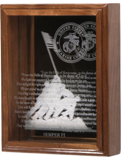 Marine Corps 3-D Mirror Memorial Case - USMC EGA emblem and USMC Hymn engraved on the glass front. Iwo Jima Memorial is engraved on mirror behind the glass giving it a 3-D effect. Solid walnut wood. Made in the USA!