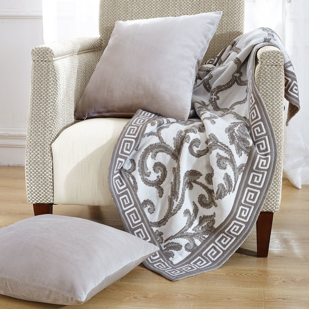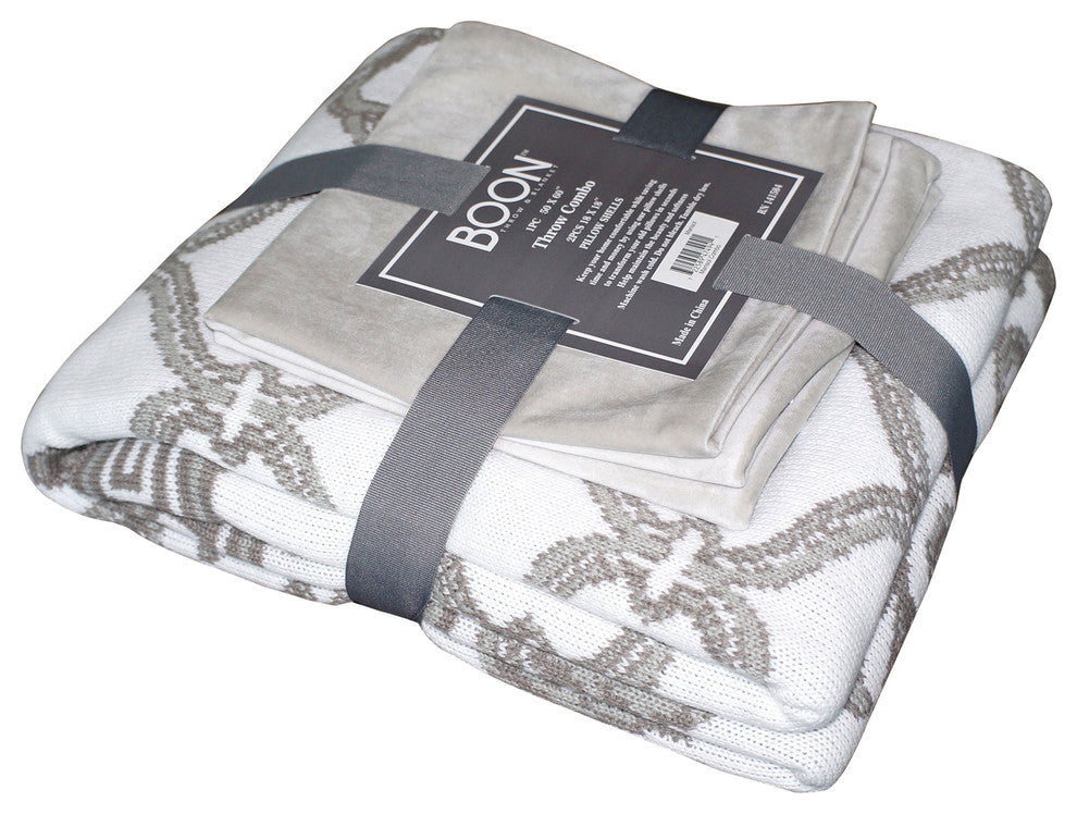 The Marisol Knitted Throw and Matching Pillow Shell Combination 3 piece set is a fully functional and super soft Home decor "Must Have". A brilliant Marisol pattern across a high quality fabrics that feels great on the skin and will keep anyone warm on a chilly night. This set feels smooth to the touch and the knitted patter makes it fully breathable, makes it perfect for summer and spring time use. The Marisol pattern is a floral vine in a light and dark grey accent, and across the border is a repeating geometric swirl.This set is great for Home Decor, guard covering a couch or seat, or you can use this to cover old throw pillows to make them look brand new again.The blanket is made of Acrylic, and the two throw pillow shells are made of polyesters. This set is very easy to care for and machine washes well in cold water on low, and tumble dry on low and low heat. Elegant and smooth Marisol designComes with 1 standard sized throw blanket and 2 standard throw pillow casesThrow Blanket size is 50" x 60"2 Throw pillow cover sizes are 18" x 18"Throw and Pillow shell is EZ MatchingThrow is 100% AcrylicPillow Shell is 100% PolyesterWrinkle FreeMachine Washable wash cold waters on low and Tumble Dry Low with low heatDo not Bleach