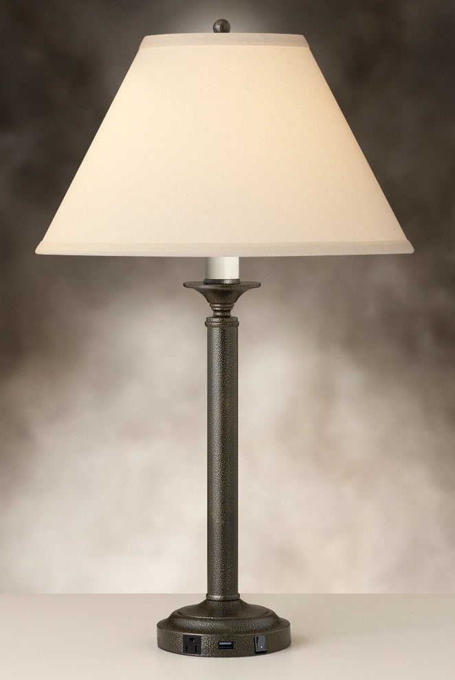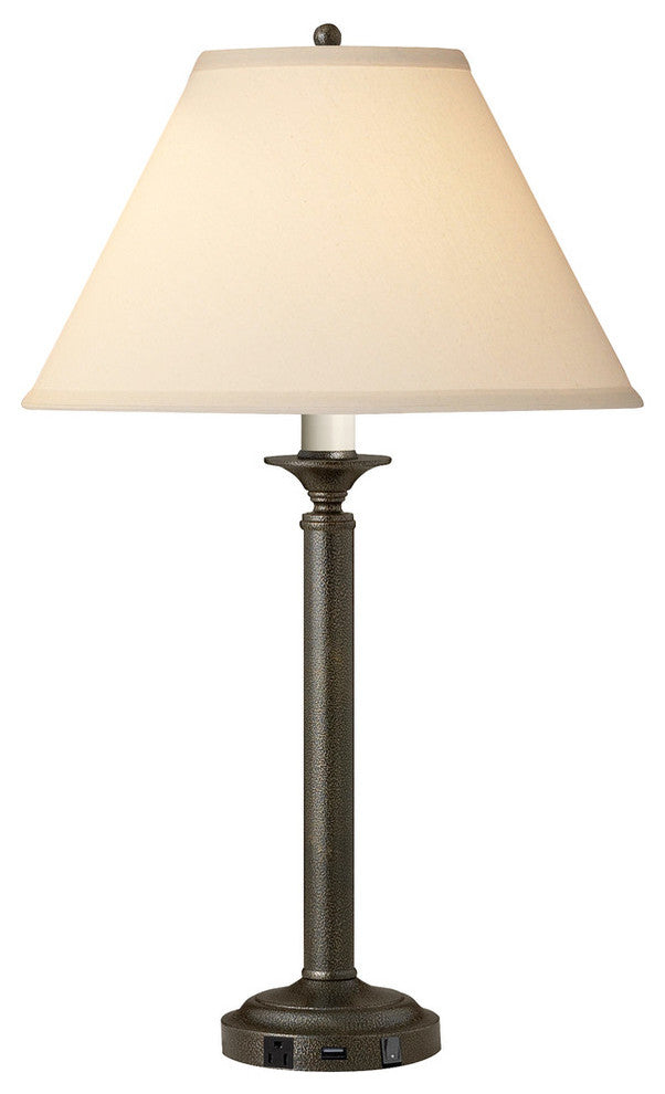Standard Lamp Specifications for #UWB452:Product Type: Single Nightstand LampHeight: 30"''Finish: Hammertone BronzeConstruction: SteelSocket: (1) Aluminum On/Off Med. Base Type A 150W Max socket(s). (Bulb not included)Switching: (1) On/Off Rocker switch(es) located on the base.Cord: 8'' (from base) long black 16 gauge cord set with a 3 prong grounded plug.Electrical Outlet: (1) 3 prong grounded outlet(s).Data Port: None.USB Port: (1) 10W/2A USB port(s).UL/CUL and/or ETL listed: YesHarp Size: 8.5 inches (including the saddle)Standard Packing: 2 per carton (shade packed separately).Lamps & Shades per SKU: 2Lamping: (1) Aluminum On/Off Med. Base Type A 150W Max socket(s).Shade Size and Description: Light beige lenore fabric laminated to styrene hardback with self fold trim measuring 7" x 17" x 11" w/1" drop (Top x Bottom x Slant).Bulb Included: NoMaterial Description: constructed from polished, plated, and lacquered steel.