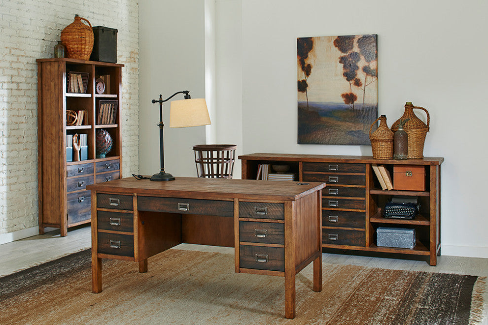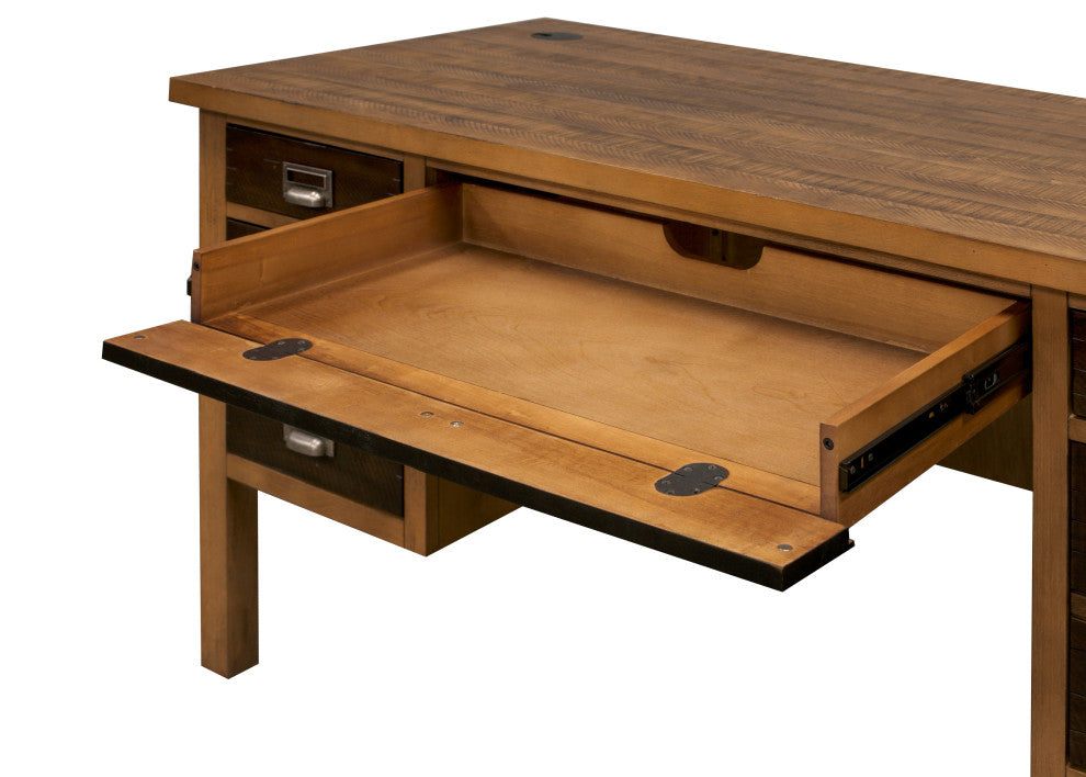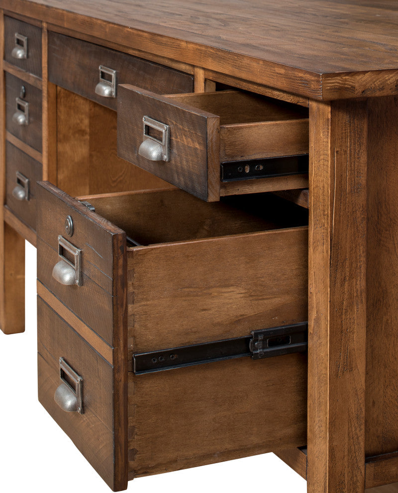 The Heritage Hickory Half-Pedestal Storage Desk has a classic, handmade look. Its hickory finish has been applied by hand. Its vintage index card pulls and dovetail drawers add charming finishes to this piece. Two utility drawers, two locking filing drawers and one keyboard shelf streamline your work area.