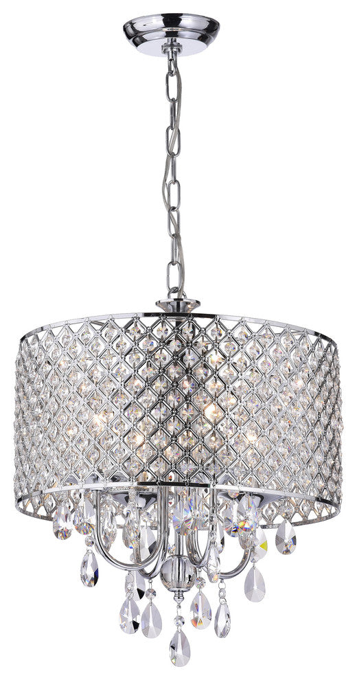 This fixture features a crystal beaded chrome drum shade, three rows of cascading hanging crystal pendants and a chrome finish. It features a 40-inch adjustable chain that would make it perfect for practically any ceiling height or room size and the 4 light designs ensures that a subtle glow of light is emitted in the room that adds drama and mood lighting. This beautiful chandelier would beautifully adorn any bedroom, living room or bathroom with ambiance, light and style that captures the eye no matter what angle you look at it.