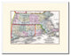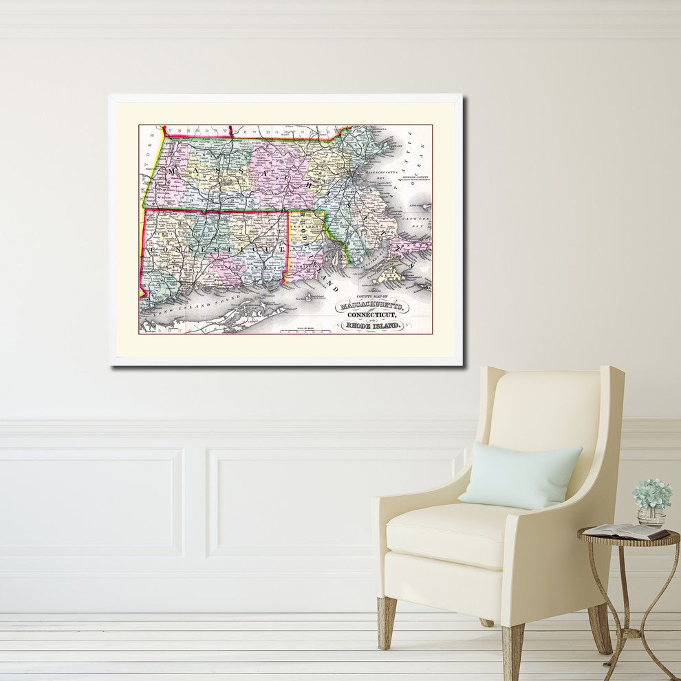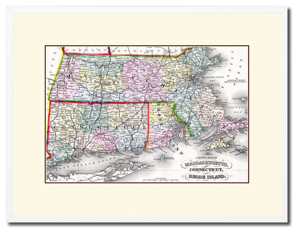 Massachusetts Connecticut Rhode Island Old Map On Canvas With Frame 16" X 21"