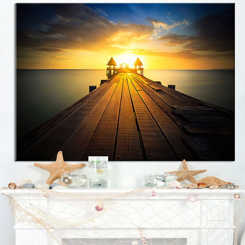 The Massive Wood Pier to Sun at Evening canvas art print is sure to make an impression on anyone who sees it. This artwork is gallery wrapped around a 1-inch solid wood frame and arrives carefully packaged and entirely ready to hang on the wall. Design Art only uses the highest resolution and pigments to ensure a crisp colorful print that is never faded or pixelated. This artwork is sure to be a conversation starter in any home or office.