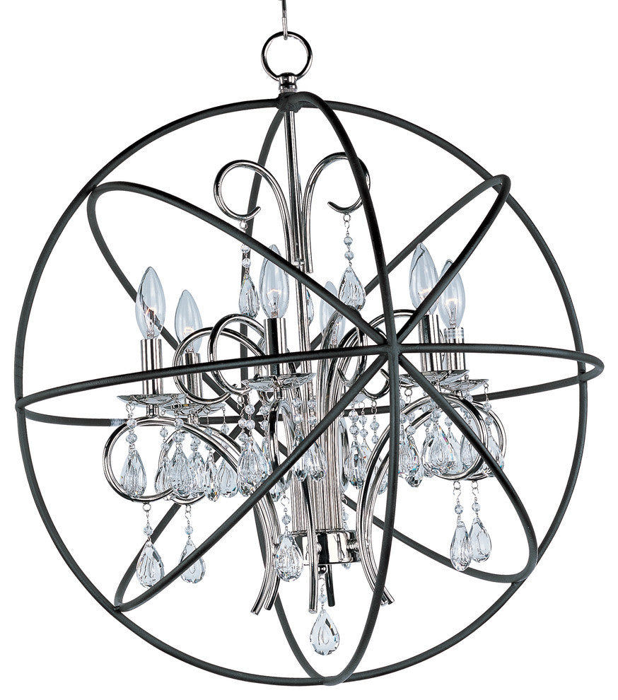 This 6-Light Up Chandelier is part of the Orbit Collection and has an Oil Rubbed Bronze finish. It is Dry Rated.A spherical frame of metal surround a simple line chandelier draped in crystal for a transitional style that fits any interior design. Orbit is available in 2 sizes and 2 finishes, Oil Rubbed Bronze with Cognac crystal and a combo finish of Anthracite and Polished Nickel with Clear crystal.Illumination:-Bulb type: Incandescent-Socket type: Candelabra-Number of bulbs: 6-Max wattage: 60-Bulb(s) included: NoStyle:-Finish: Oil Rubbed Bronze-Collection: Orbit-Wire/Cord Length: 180"-Chain: 36"-Material: MetalAdditional info:-Rating: Dry Rated-Voltage: 120-Weight: 17.67 lbs.-Warranty: 1 year
