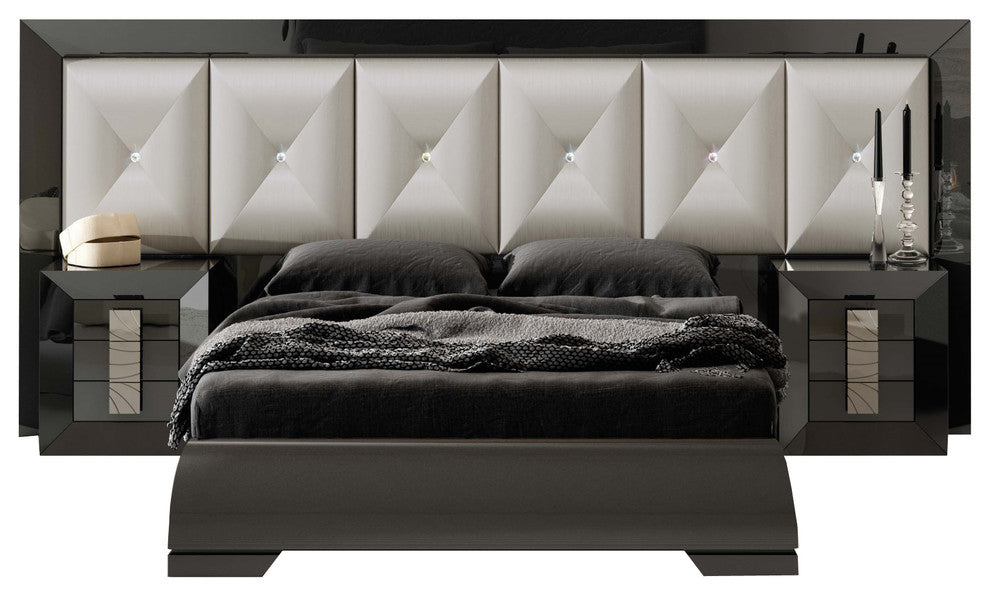 Md karen 28 special headboard for your bedroom. Glossy gray frame and silver panel, nightstands handles are in silver gloss. Add high quality and high elegance to your room with this stylish and unique piece of furniture - Swarovski crystal buttons in the silver silk fabric upholstered panel. The price includes the special headboard + the bed base (king/ queen) + the 2 nightstands.Not included: bedding, lamps, or any other item for decorative purpose. This bedroom set is available in queen or king size. See measurements below: headboard (125"-138") w x 55" h x 4" dimportant: queen size 125" w and king size 138" w. Bed base king: 80" w x 82.7" l x 14" h / queen: 64" w x 82.7" l x 14" h. Nightstands 22" w x 24" l x 14" h. Everything is made in Spain, European brand.