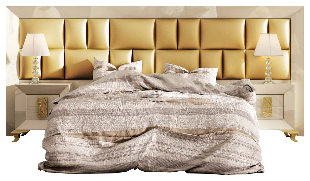 Md karen 29 special headboard for your bedroom. Glossy cream beige frame and gold panel, nightstands handles and legs are in gold gloss. Add high quality and high elegance to your room with this stylish and unique piece of furniture - Swarovski crystal buttons in the gold silk fabric upholstered panel. The price includes the special headboard + the bed base (king/ queen) + the 2 nightstands.Not included: bedding, lamps, or any other item for decorative purpose. This bedroom set is available in queen or king size. See measurements below: headboard (125"-138") w x 55" h x 4" dimportant: queen size 125" w and king size 138" w. Bed base king: 80" w x 82.7" l x 14" h / queen: 64" w x 82.7" l x 14" h. Nightstands 22" w x 14" l x 25" h. Everything is made in Spain, European brand.