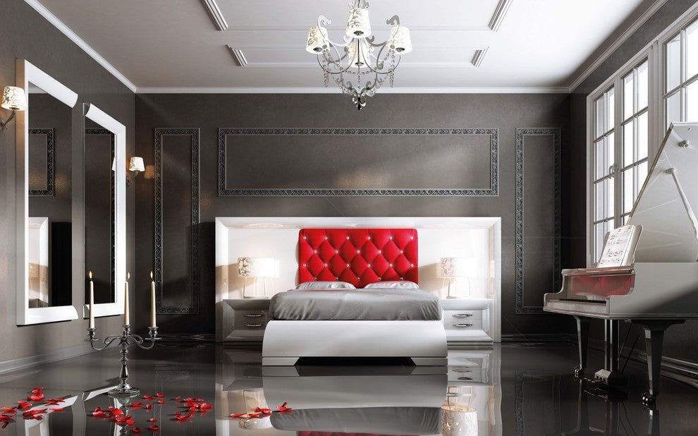 Md sophie 36 special headboard for your bedroom. Glossy white frame and red panel, nightstands handle are in polished chrome. Add high quality and high elegance to your room with this stylish and unique piece of furniture - Swarovski crystal buttons in the red silk fabric upholstered panel. The price includes the special headboard + the bed base (king/ queen) + the 2 nightstands.Not included: bedding, lamps, or any other item for decorative purpose. This bedroom set is available in queen or king size. See measurements below: headboard (125"-138") w x 55" h x 4" dimportant: queen size 125" w and king size 138" w. Bed base king: 80" w x 82.7" l x 14" h / queen: 64" w x 82.7" l x 14" h. Nightstands 24" w x 16" l x 20" h. Everything is made in Spain, European brand.