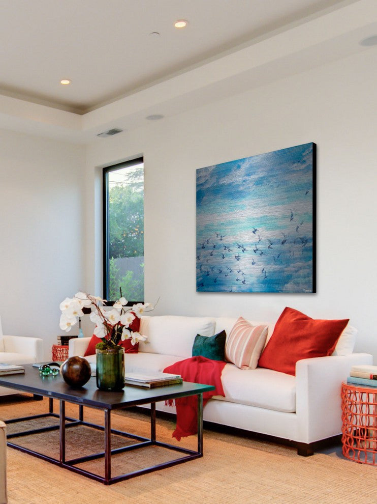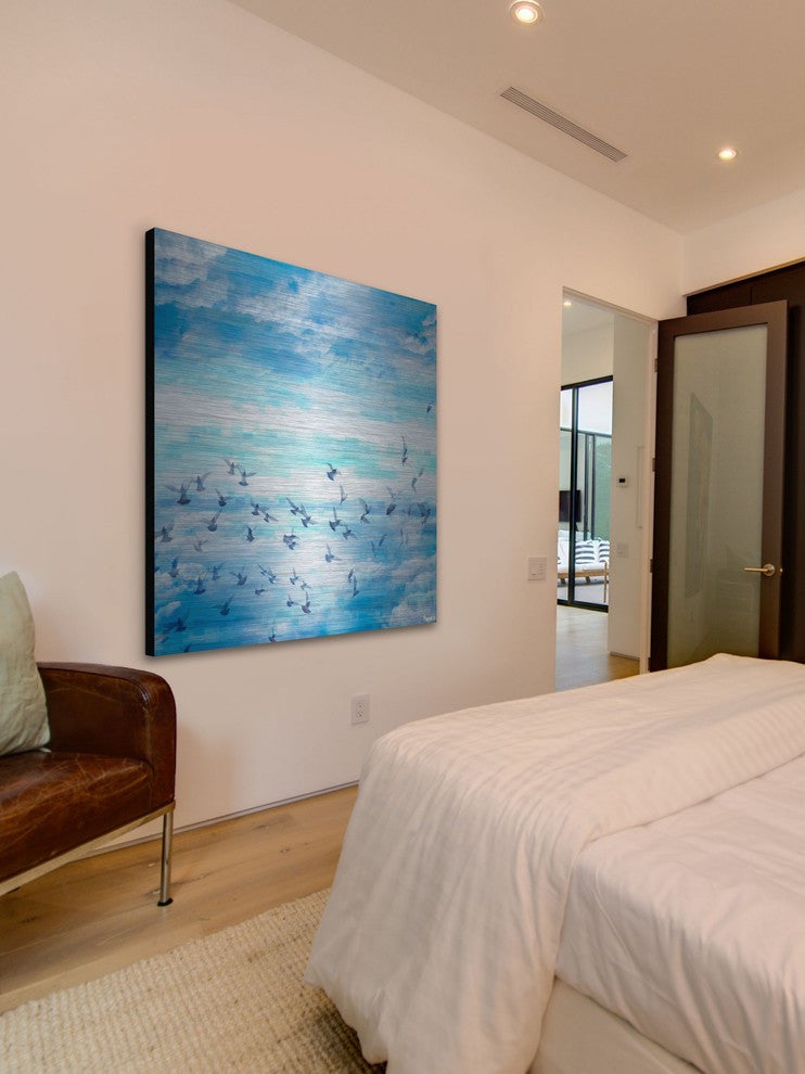 Striking and unique, the "Meadow Flock" Print on Brushed Aluminum by Parvez Taj will bring your walls to life. Printed on aluminum, this 24 inch wide by 24 inch tall contemporary artwork will make a statement in any living room, dining room, or bedroom.- Fine art UV ink print on brushed aluminum by Parvez Taj- The aluminum pops the colors and creates an iridescent shimmer, which gives depth to a room- Arrives ready to hang - Includes a certificate of authenticity- Artist signature on the front