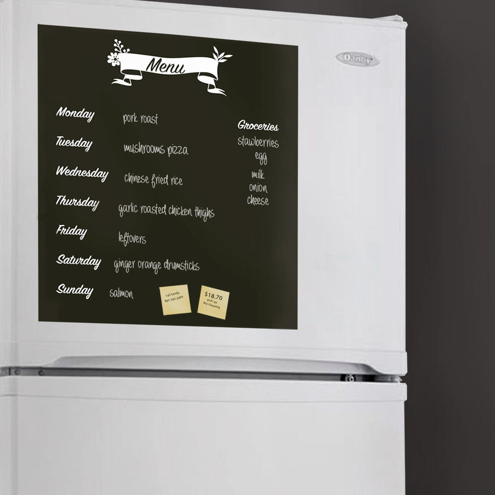This meal planner wall decal incorporates a black chalkboard vinyl that you can write on with chalk or chalk ink pens. It is applied directly to the wall, refrigerator, or any other flat surface! size: Overall Size (approx): 23"w x 16"h / 16"w x 23"hcolor: Menu banner and Lettering decals : white Chalkboard body decal : blackwhats included: Black Chalkboard decal (16 inch x 23 inch it can be trimmed to fit any space)Menu bannerLettering decals (2 sets, just in case!)One 6mm White Chalk Ink Pen