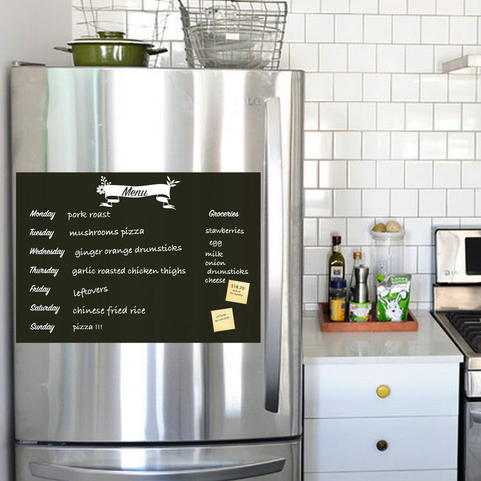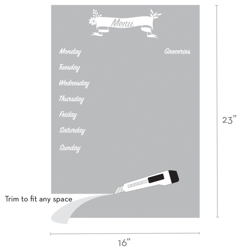 This meal planner wall decal incorporates a black chalkboard vinyl that you can write on with chalk or chalk ink pens. It is applied directly to the wall, refrigerator, or any other flat surface! size: Overall Size (approx): 23"w x 16"h / 16"w x 23"hcolor: Menu banner and Lettering decals : white Chalkboard body decal : blackwhats included: Black Chalkboard decal (16 inch x 23 inch it can be trimmed to fit any space)Menu bannerLettering decals (2 sets, just in case!)6 Color Chalk Ink Pen Set