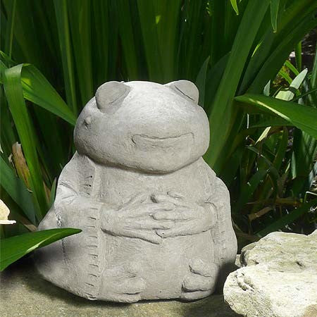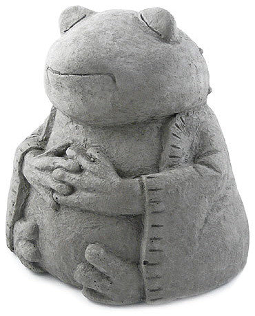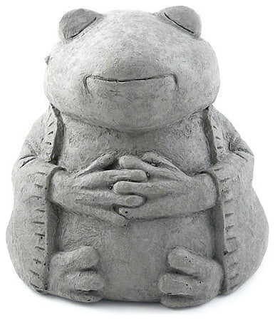 Buddhist thought has long regarded animals as perceptive entities, capable of obtaining a sense of enlightenment. The frog has long been considered a representation of wealth and prosperity. Our Meditating Buddha Frog is a perfect symbol for those who appreciate the spirit of zen, those who strive for good fortune, or those who simply love frogs!Cast in strong, high-quality solid concrete - perfect for outdoor use in any climate, the buddha frog adds the perfect dose of delight to your patio or garden! Measuring just over 7" tall, the concrete sculpture includes integrated color pigments to create a consistent color finish that will never flake or fade. Includes the Chinese characters for Prosperity on the reverse of his robe, an appropriate marking for our lucky amphibian friend.Solid cast stoneIntegrated colorDesigned and made in the USA