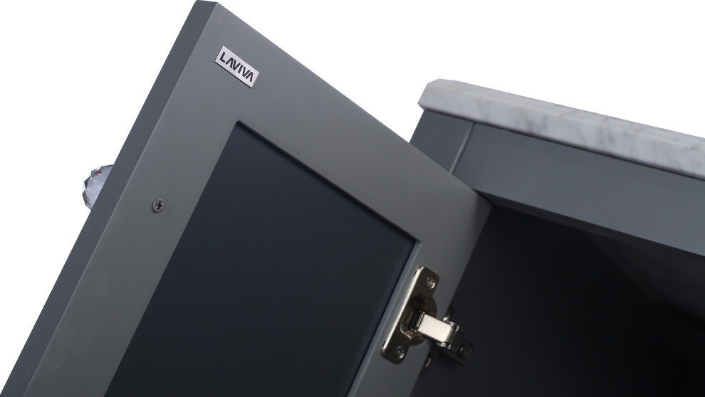 Mediterraneo - 36 - Grey Cabinet + Black Wood Marble Countertop313MKSH-36G-BW Mediterraneo - 36 - Grey Cabinet + Black Wood Marble Countertop, Presenting the Mediterraneo Collection, if you re going for the Putting on the Ritz look, with a nod to classical vintage, this look brings its classic relevance to today s bathrooms. The Mediterraneo vanity features a real wood cabinet with doors that showcases classical cut-outs, layered onto a mirrored glass background. As you reach for the crystal glass knobs on the cabinets soft-closing doors, they open to an open bottom platform which contains a surprise hidden drawer with soft closing rails. Style and functionality have indeed married and produced this fantasy beauty, come to reality in two finishes: Grey and Classic White. Still seeking more storage? A coordinating tall side cabinet commands your attention and completes the ritzy elegant look.Model No : 313MKSH-36G-BWSolid Oak Wood and Plywood ConstructionSoft Closing Doors and DrawersMarble CountertopUndermount cUPC 20" rectangle ceramic sink3.2" matching backsplashAdjustable FeetSingle Hole Faucet Mount (Additional Holes Upon Request) Crystal HandlesVanity Comes Pre-assembledDovetail Drawers