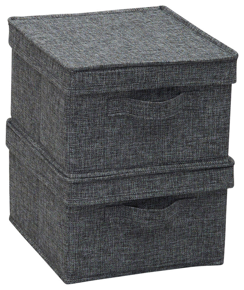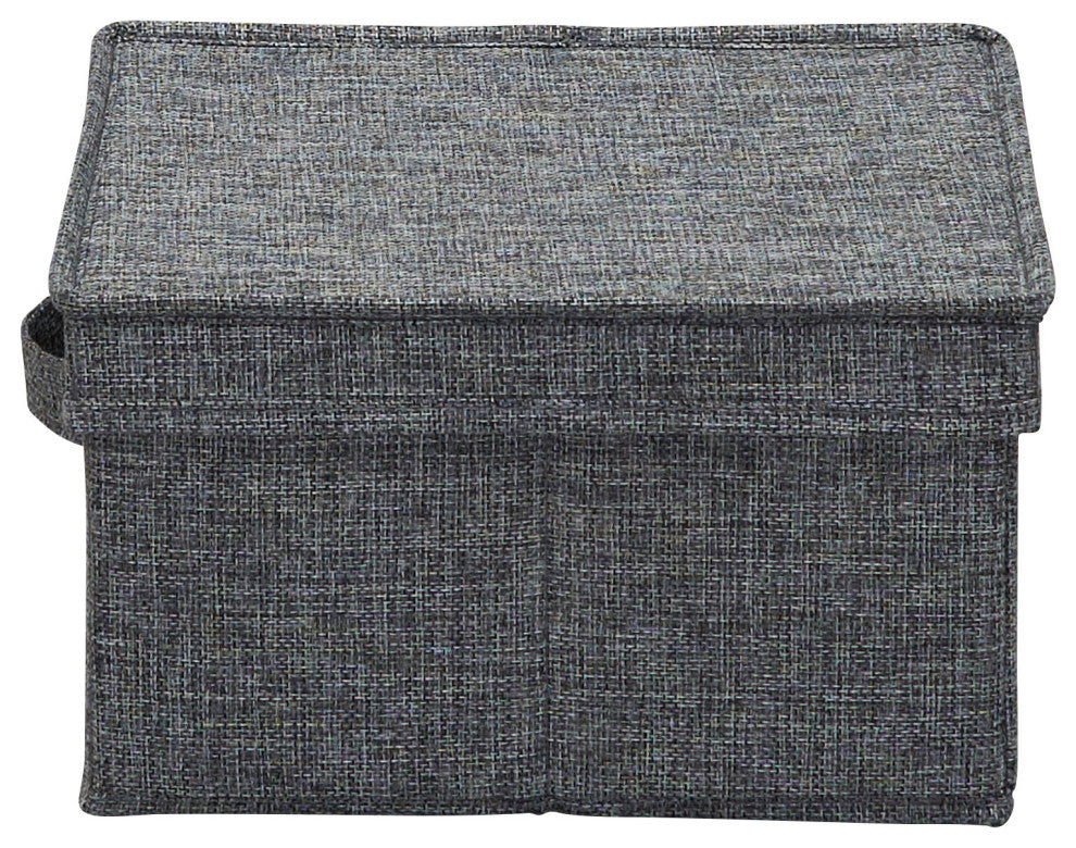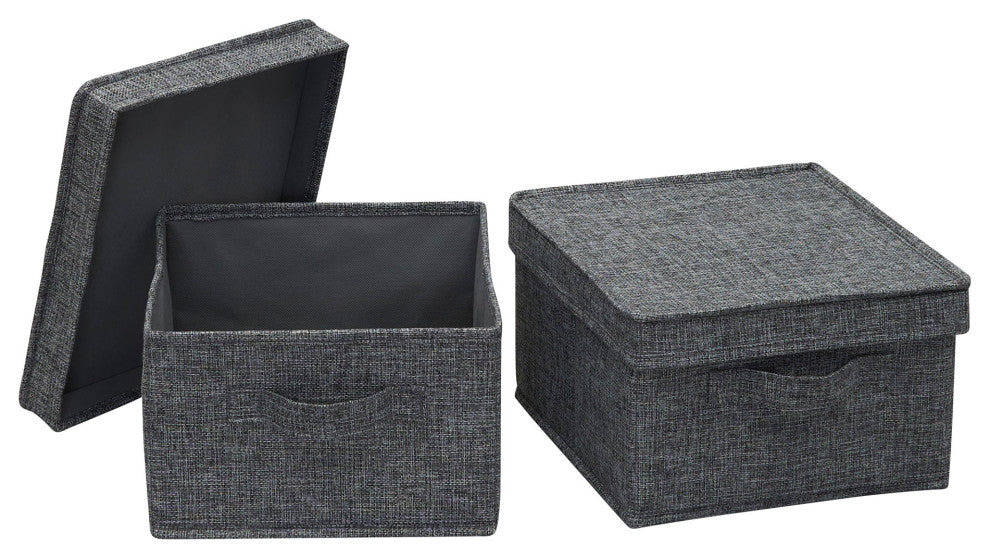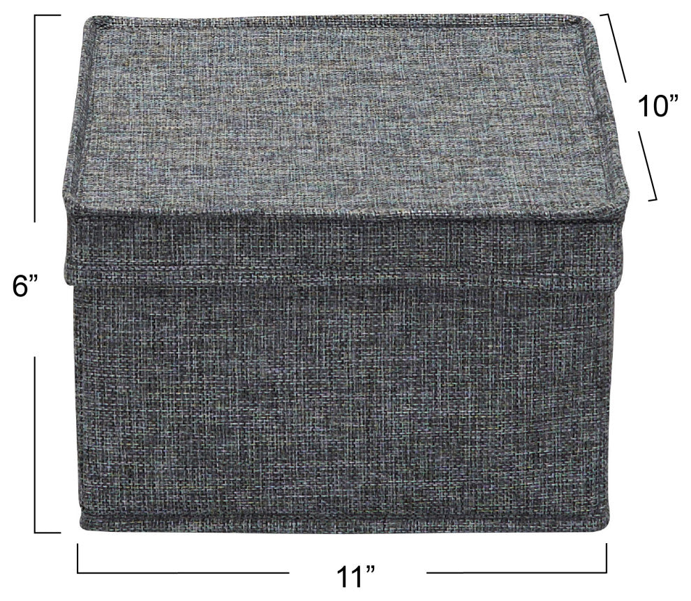 This set of 2 fabric storage bins is sure to keep any room organized. The bins'' exterior lining is made of a luxe, poly blended fabric, which is soft to the touch and durable as well. The sides are reinforced to support the contents inside and allow the bins to be stacked to save space. Their cool gray coloring and stylish trim makes these bins attractive, without detracting from existing decor or styles. The attached handles make moving the bins effortless, while the fully removable lid gives quick and easy access to items inside the bins. This storage box is also a space-saver when not in use; the item folds completely flat to be stored away until needed. Use this pair of storage bins anywhere in your home, office or dorm for elegant storage and organization. The item is 6" H x 10" W x 11" D, making it perfect for most shelving in your bedroom, bathroom or hallway closet. It can hold a variety of items from small to bulky, such as linens, sewing supplies, clothing accessories and much more. This canvas storage bin set pairs well with any decor style and can be used a variety of different ways throughout your home. It is the perfect solution if you wish to declutter or organize your living space.