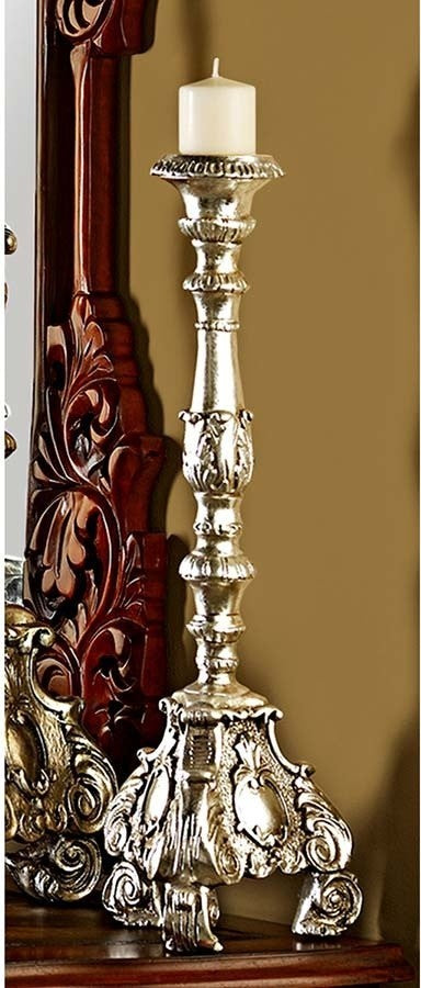 Introduce a bit of Old World elegance into your home with this antique replica European candlestick. A pair lends your room the romance of a bygone era while illuminating it with a soft glow of candlelight. Our Design Toscano quality designer resin torchieres are ornately decorated with detailed carving around the neck and base of the candlesticks. They are scroll footed with a baroque base design. This European antique replica candlestick will hold your pillar candles while lending any room the rich romance of 17th-century style. Candles not included. Medium: 6"Wx6"Dx20"H. 3 lbs.