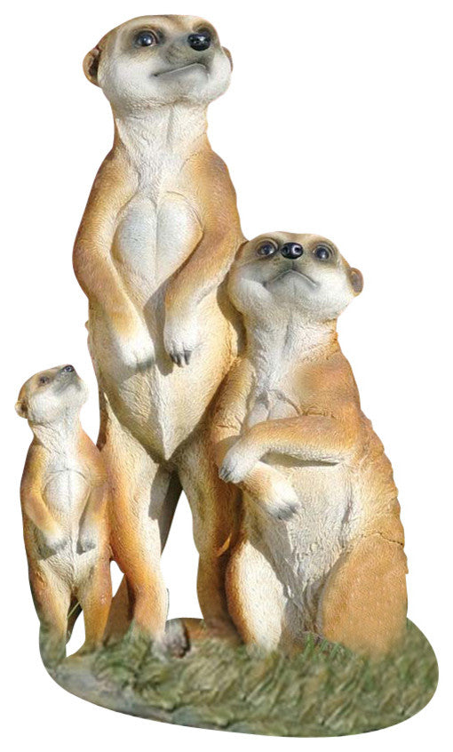 This charming family of meerkats comes straight from the Kalahari Desert to charm in your own manor! With masked eyes and fawn-hued fur, these social and generous animals will greet guests with nearly life-sized realism. This fun-loving work of decorative art is sculpted 360-degrees, cast in quality designer-resin, and hand-painted to replicate the meerkats glistening eyes and precious expressions. A Toscano exclusive! 9.5"Wx6"Dx15"H. 3 lbs.