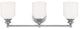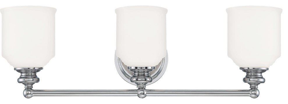 Style meets value. The Melrose vanity fixture boasts chic modern lines, white glass shades and a polished chrome finish.Voltage: 120Bulbs included: NoNumber of bulbs: 3Type of bulbs: EMax. wattage per bulb: 100Safety rating: UL, CULInstall direction: ReversibleFinish: Polished chromeMaterials: Metal and glassDimensions: W 24" x H 7.75"