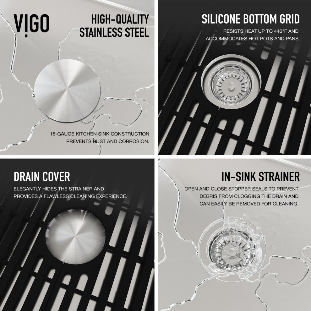 VIGO presents the Mercer Stainless Steel Undermount Kitchen Sink for modern homes. The high-grade stainless steel construction makes it scratch-resistant and easy to clean. Mercer is fully undercoated and padded with SoundAbsorb™ technology to reduce noise, allowing for a quieter kitchen experience. The deep sink basins minimize water splashing over the edges. The set comes with a sink grid to protect the surface of your sink and a sink drain strainer. It includes all mounting hardware and simple instructions for hassle-free DIY installation.Features:• EASY INSTALLATION: Undermount sink is easy to install directly underneath the countertop;• DURABLE STAINLESS STEEL: Sink is constructed from premium 304 series 16-gauge stainless steel material;• SCRATCH FREE: Silicone sink grid prevents scratches;• RUST-RESISTANT: All VIGO kitchen sinks are guaranteed to remain rust-free;• ROUNDED CORNERS: Slightly rounded corners make the sink easy to clean;• SLEEK DRAIN GROOVES: Elegant and functional drain grooves are included;Measurements:• Assembled Length:35.5;• Assembled Height: 10;• Assembled Width: 19.5;Details:• CUSTOMIZABLE INSTALLATION: Cutout template provided for 1/8 in. reveal or flush installation;• VERSATILE DESIGN: Simple design works well with a variety of kitchen styles;• CUPC CERTIFIED: Kitchen sink is cUPC certified by IAPMO;• SILENT & SHOCK ABSORBENT: Fully undercoated and padded with VIGO''s SoundAbsorb™ technology to mute noise and protect surface;• COMPLIMENTARY ACCESSORIES: this sink comes with a complimentary embossed VIGO cutting board;• PREMIUM FINISH: Commercial grade premium satin finish;• ACCOMMODATES GARBAGE DISPOSAL: This sink easily accommodates a separately installed garbage disposal;• LIMITED LIFETIME WARRANTY: All VIGO Kitchen Sinks feature a Limited Lifetime Warranty;• EASY TO CLEAN: Large and spacious, this sink is easy to clean;• IDEAL FOR ALL: Great for kitchens of all sizes;• SOLID BRASS STRAINER: The strainer is custom fitted and made of solid brass;Certifications&Warranty:• Kitchen sink is cUPC certified by IAPMO;• All VIGO Kitchen Sinks feature a Limited Lifetime Warranty;
