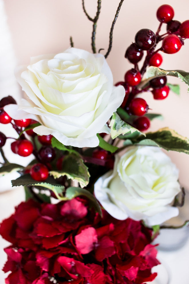 Holiday elegance in a glass vase that''s exactly what this beautiful Hydrangea, Rose and Berries arrangement offers your home or office. Beautiful Hydrangea blooms, full roses, lush berries, and a few sprigs combine to create a warm, distinct holiday feel. Nestled comfortably in a glass vase (complete with Liquid Illusion faux water), this crisp arrangement will bring cheer to your holiday table for years to come.