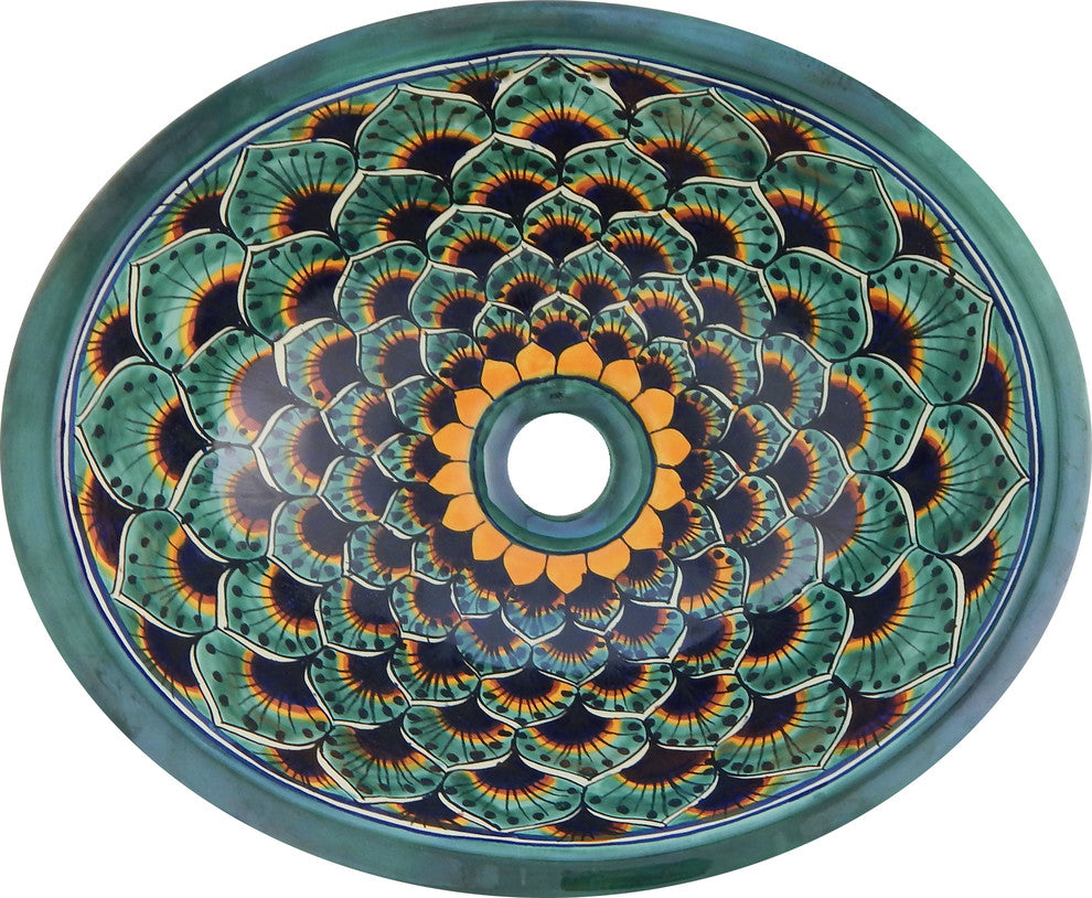 Mexican Talavera Ceramic Hand Painted Bathroom Oval Sink Green Peacock