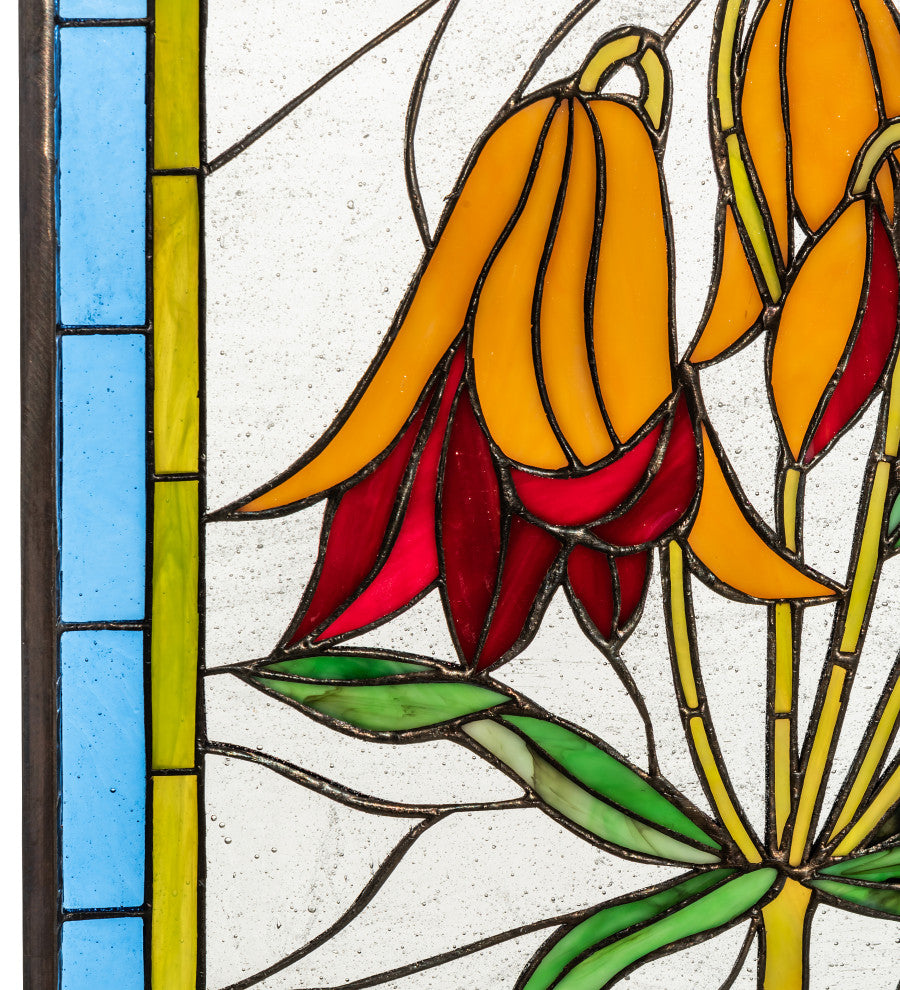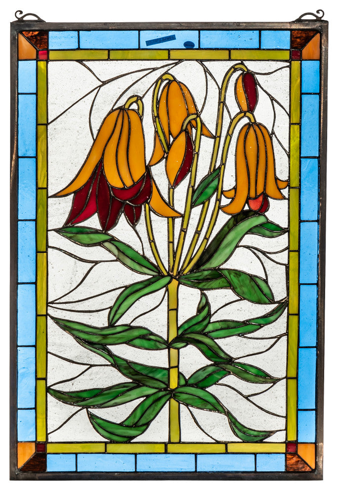 Gracefully Trumpet Lilies with Bronzed Green leaves bow their Dark Orange heads against a Clear Blue sky This Meyda Tiffany original window is handcrafted utilizing the copperfoil construction process and 219 pieces of stained art glass encased in a solid brass frame Mounting bracket and jack chain included