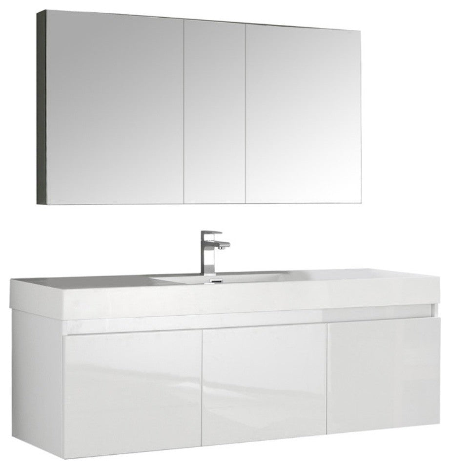 Make a bold and elegant statement in your home with this modern White vanity with integrated sink and countertop, and frameless mirrored medicine cabinet. The Fresca Mezzo line features a rectangular shaped white sink with smooth lines and a thick profile. The sink is spacious and the integrated countertop is perfect for holding basic necessities. The modern basin is equipped with an overflow and has a single hole faucet mount. This sink sits atop a wall mounted elegant White bathroom cabinet that features 3 visible, soft closing drawers with 3 nested drawers inside. Innovative BLUMOTION drawer runners offer smooth, silent closure, great stability and less sag when the drawer is fully loaded. This rectangular floating bathroom cabinet measures 60" in width. With its elegant White finish, it will add a chic modern touch to your bathroom.The frameless Medicine Cabinet is mirrored inside and out. It has two doors with mirrors on both sides, allowing you to keep an eye on your appearance while accessing daily necessities from within the cabinet. It has two adjustable tempered glass shelves that can accommodate items of varying heights. An anodized aluminum frame creates a moisture and dust resistant interior This medicine cabinet blends beautifully with any decorating scheme. It measures 49" wide x 26" high x 5" deep.Features:- Dimensions of Vanity: 59"W x 18.9"D x 21.6"H- Dimensions of Medicine Cabinet: 49"W x 26"H x 5"D- Vanity Materials: Constructed Using the Highest Grade MDF, Engineered for Moisture Resistance- Blum TANDEM Plus BLUMOTION Drawer System, Hidden / Nested Drawer- 6 Soft Closing Vanity Drawers- Sink Materials: Highly Durable Acrylic-Resin Sink with Integrated Rectangular Overflow- Single Hole Faucet Mount (Faucet Shown In Picture May No Longer Be Available So Please Check Compatible Faucet List)- Medicine Cabinet Materials: Anodized Aluminum, Moisture and Dust Resistant Frame- Modern Frameless Three-Mirror Design Medicine Cabinet with Adjustable Clear Glass Shelves- Recessed and Surface Mount Kits Included For Medicine Cabinet- Included: Base Cabinet, Countertop/Sink, Free Solid Brass Faucet, Mirrored Medicine Cabinet, P-trap, Pop-Up Drain and Installation Hardware- Overflow: Yes- Sink Color: White- Sink Dimensions: 20.25"x13"x4"The Fresca Mezzo line features a rectangular shaped white sink with smooth lines and a thick profile. The sink is spacious and the integrated countertop is perfect for holding basic necessities. It sits atop a rectangular wall-mounted floating White vanity that features 3 visible, soft closing drawers with 3 nested drawers inside. The frameless Medicine Cabinet has two doors with mirrors on both sides and two adjustable glass shelves to hold items of varying sizes. This lovely vanity and medicine cabinet is available in multiple sizes to give a chic, modern touch to any bathroom.This single hole faucet is made from heavy duty brass with a chrome finish. Features ceramic mixing valve for longevity and watertight functionality. FFT3811CH Features: - Dimensions: 1.8"W x 5.4"D x 5.9"H - Spout Height: 3.3" - Spout Reach: 4.4" - Finish: Chrome - Ceramic Mixing Valve - 1/2" - 14 NPS Connection - All Mounting Hardware Included