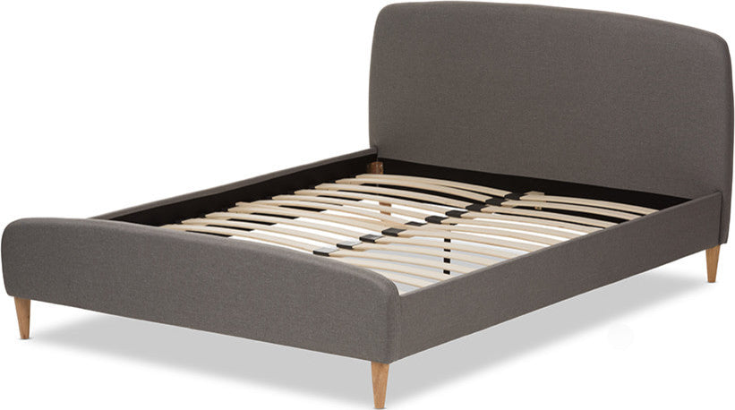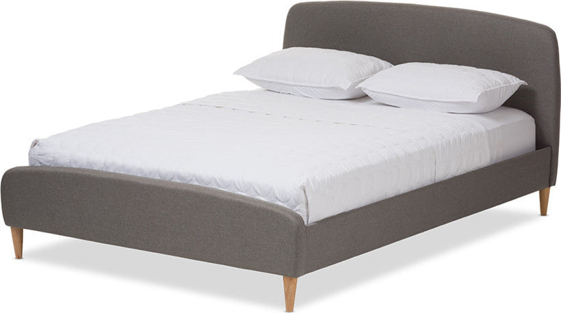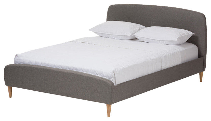 Illustrate mid-century design in your home with the sleek minimalist looks of the Mia fabric upholstered platform bed. Gently curved in shape, the Mia features clean lines for an elegant silhouette. Available in dark charcoal gray, light beige and light gray polyester fabric, the Mia is constructed robustly with solid wood and engineered wood for a long lasting look. Solid rubberwood legs in natural finishing provides ultimate sturdiness, excellent quality and a superior support structure. The Mia platform bed, a clean piece of furniture with modern style-lines and its tapered, solid wood legs give resurgent accents to your mid-century aesthetic. Made in Malaysia, the Mia requires assembly.