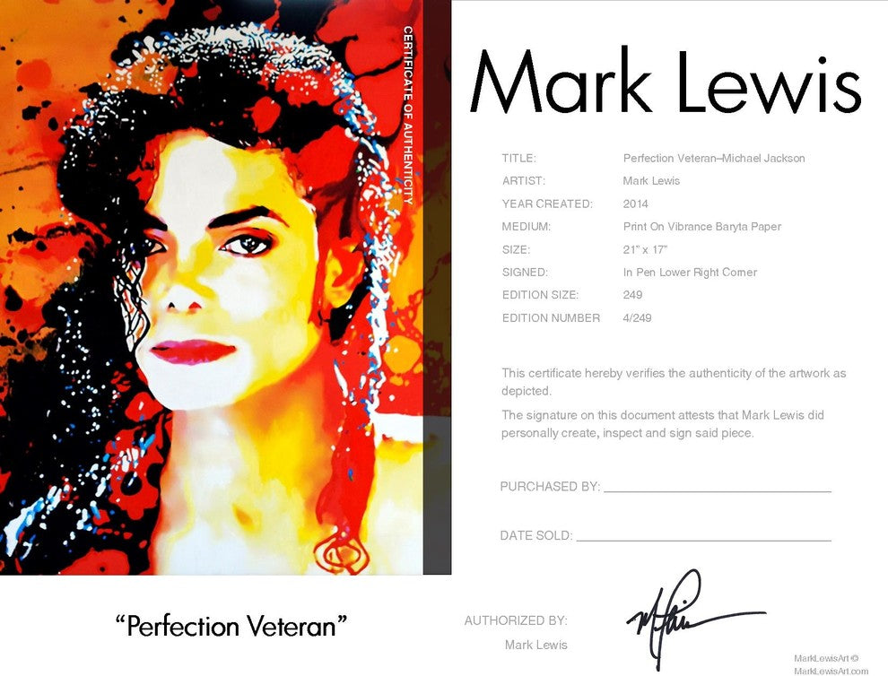 Michael Jackson "Perfection Veteran" by artist Mark Lewis. Lewis is a living relative of Denton Cy Young the legendary baseball player and Baseball Hall Of Fame recipient. This collectible limited edition art is titled "Perfection Veteran" The subject is Michael Jackson. The complete edition Size is 249. Each piece of artwork will be delivered with a "Certificate of Authenticity" Mark Lewis, a renowned artist from southern California, has created his first giclee, print and poster series now available to the public. Born Mark Alan Holmes in Akron, Ohio, raised in Charter Oak, California, Marks'' career path has certainly been an eventful one. After serving honorably in the United States Navy Lewis then delved into the performing arts. He spent years as a successful actor, appearing in numerous movies and television programs. Ultimately turning his focus to painting, Lewis brought his expansive life adventures, raw talent and inspiration to the canvas. Lewis instills an immense beauty and creativity in the work that flows from his palette. He achieves that rare feat among artists of creating an unspoken dialog between artist and viewer in his work. Lewis'' paintings, prints and posters have been exhibited in numerous galleries throughout the U.S.MEDIUM: This art is a fine art print on Vibrance Baryta paper. Hand signed and numbered by the artist Mark Lewis. ( This artwork is not a poster )SPECIFICS: Frame Size - 25" x 21" Art Print Edition Size - Limited Edition of 249 - The number delivered will be randomCERTIFICATION: This art is delivered with a signed and dated Certificate of AuthenticityFRAMING: This art is framed in a black 2 1/2" frame and ready to hang in your home
