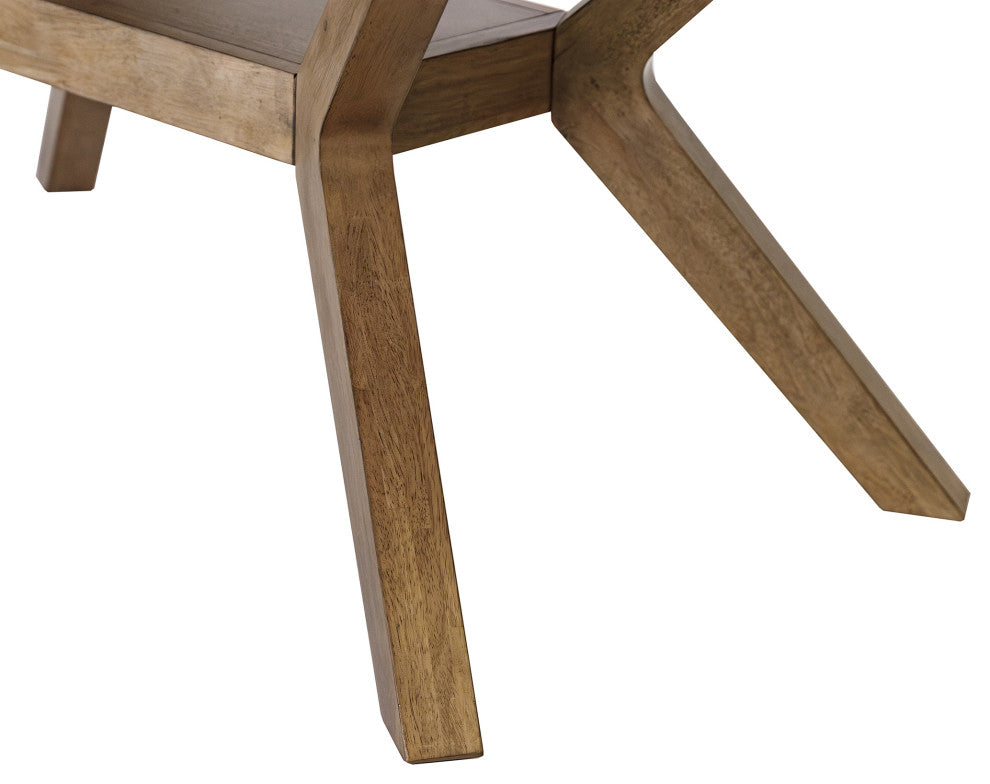 The Shelby dining collection honors classic mid-century design. Its rich caramel finish highlights the veneer patterns and emphasizes the natural beauty of this exotic wood. Angle-backed chairs are simple and comfortable capturing the essence of the minimalist era. Luxuriously soft dusty blue fabric adds color and invites you to relax and enjoy the moment.