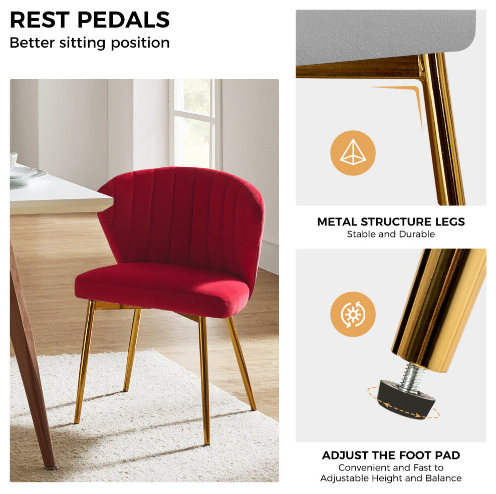 This classic and traditional style accent chair with pleated details is the perfect pick for small space. Whether drawn up to your dining table or rounding out your living room with an extra seat, a small side chair like this is a great option wherever you need it. Made with premium velvet fabric,comfortable for skin touch. High-density foam filling with a solid and manufactured wood frame provide comfort and support.The slender polished gold metal legs bring the modern design,and add to the timeless fashion of this piece.Product includes: Two Mid Century Modern Side ChairsUpholstered with premium velvet fabric,comfortable for skin touch,available in 5 colors-Yellow,Teal,Pink,Navy,Orange.High-density foam filling with a solid and manufactured wood frame provide comfort and supportProduct DetailsWeight Capacity: 250 lbsFrame Material: Manufactured WoodBack Fill Material: Foam Seat Fill Material: FoamWeights & DimensionsItem Size: 20"Wx19.5"Dx29"HSeat Size:19"Wx16.5"Dx17.5"HBack Height to Seat: 12.5Item Weight: 24.30Leg Height: 14.8Minimum Door Width - Side to Side:25SpecificationsUpholstered: YesArms Included: NoOttoman Included: NoPillow Included: NoInstructions:Because the size of the product is measured manually, there may be errors.Country of Origin: China